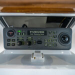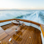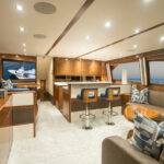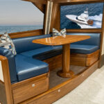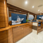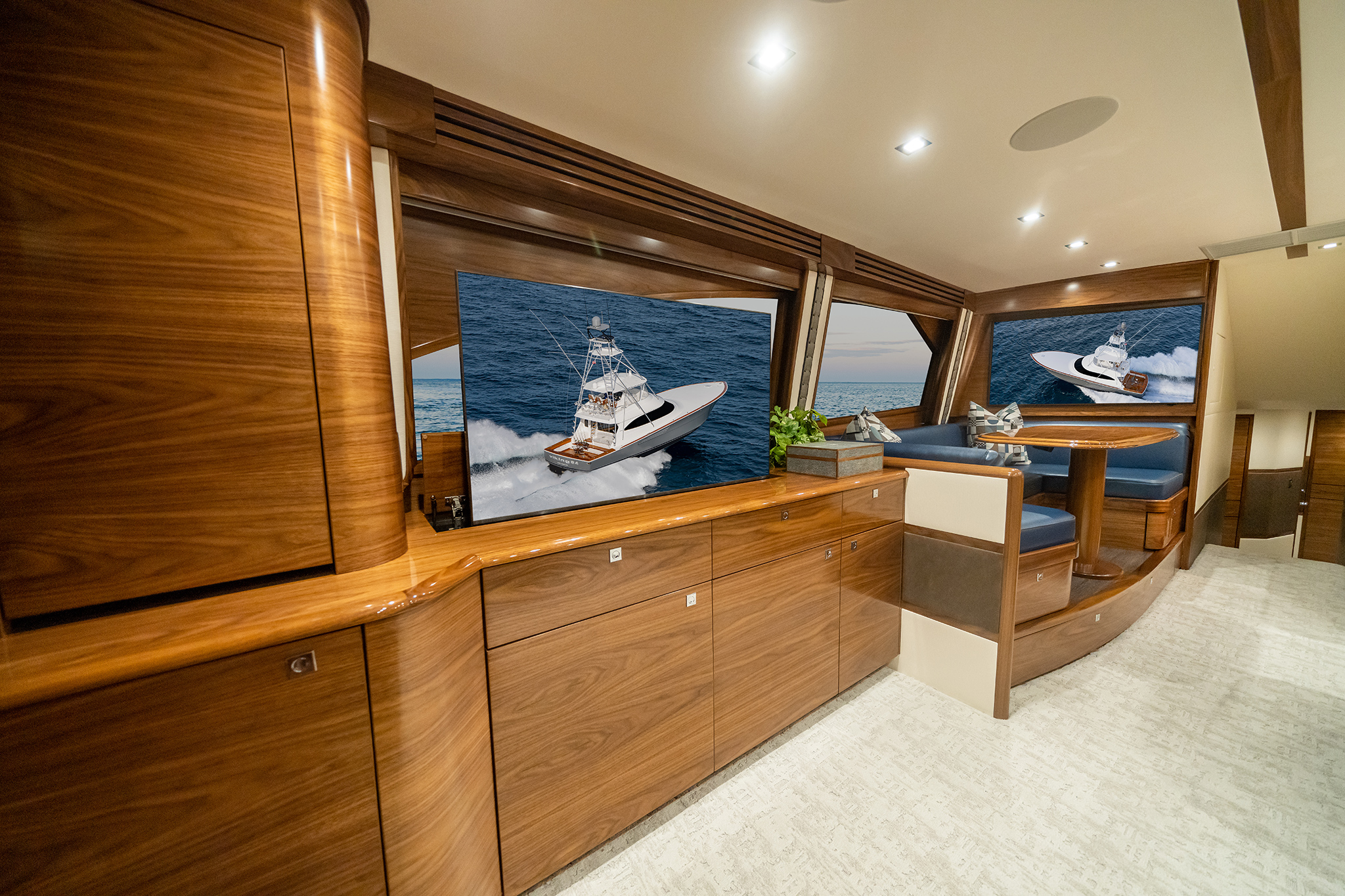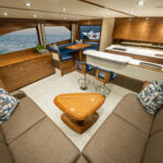 The interior features horizontal natural walnut throughout, available in a hi-gloss or satin finish. The joinery work is phenomenal, with all cabinetry built in-house. The electrical distribution panel is immediately to port in a dedicated cabinet. Just forward is a 50-inch pop-up HD TV, which is the centerpiece of the home theater center on the port side. The starboard-side L-shaped lounge (with storage underneath) provides plenty of room to stretch out and take a nap, or gather with the crew or family to watch a game or movie. There’s also a convenient walnut cocktail table so everyone has place for their drink.
