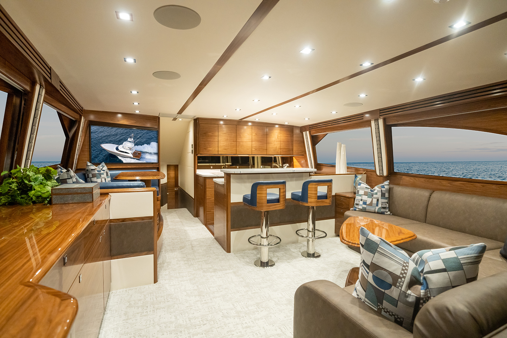 With a push of a button, the electric-powered salon door slides open, revealing the 64’s spacious salon. Like its two most recent predecessors, the Viking 54 and 58, our new convertible features an open layout with a walkway that extends in a straight line from the salon all the way to the forepeak, heightening the sense of depth and space.