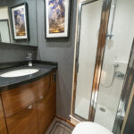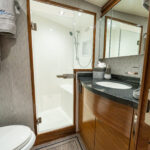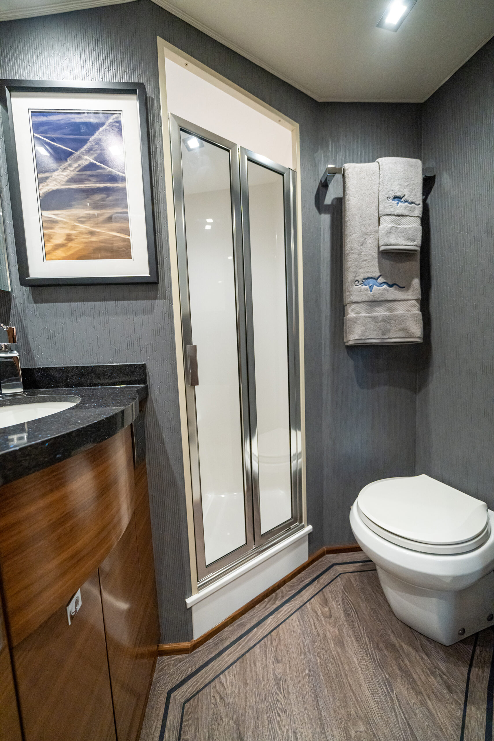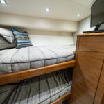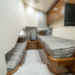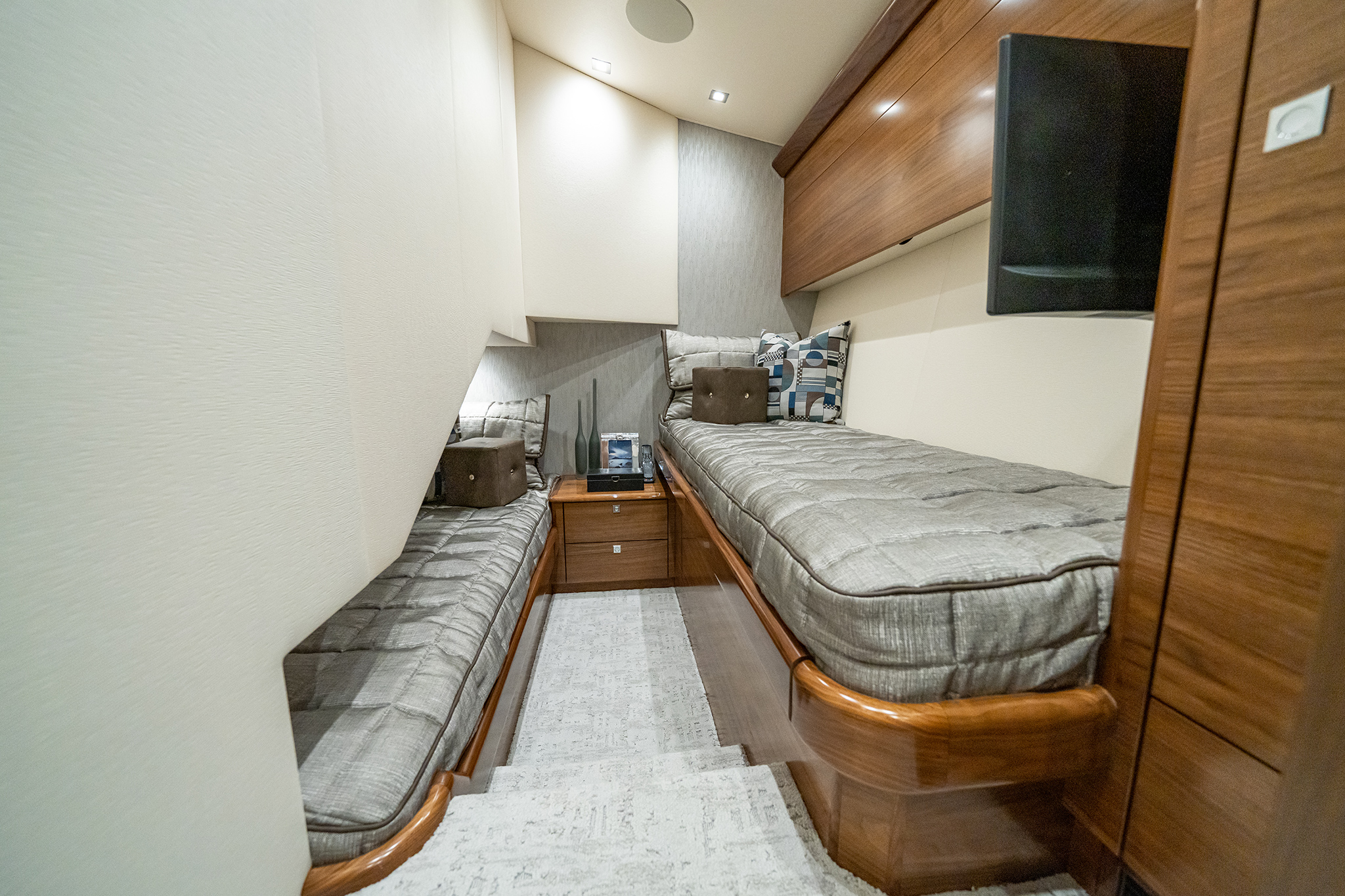 The port side is dedicated to a guest (aft) and crew stateroom (forward). Both are appointed with the same high level of luxury and are uniquely designed to maximize comfort and function. The guest stateroom features side-by-side bunks, while the crew quarters have upper and lower bunks. Maple-lined hanging lockers, speakers recessed in the headliner and decorative indirect rope lighting round out the conveniences.
