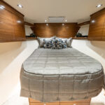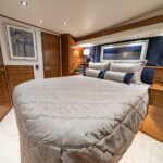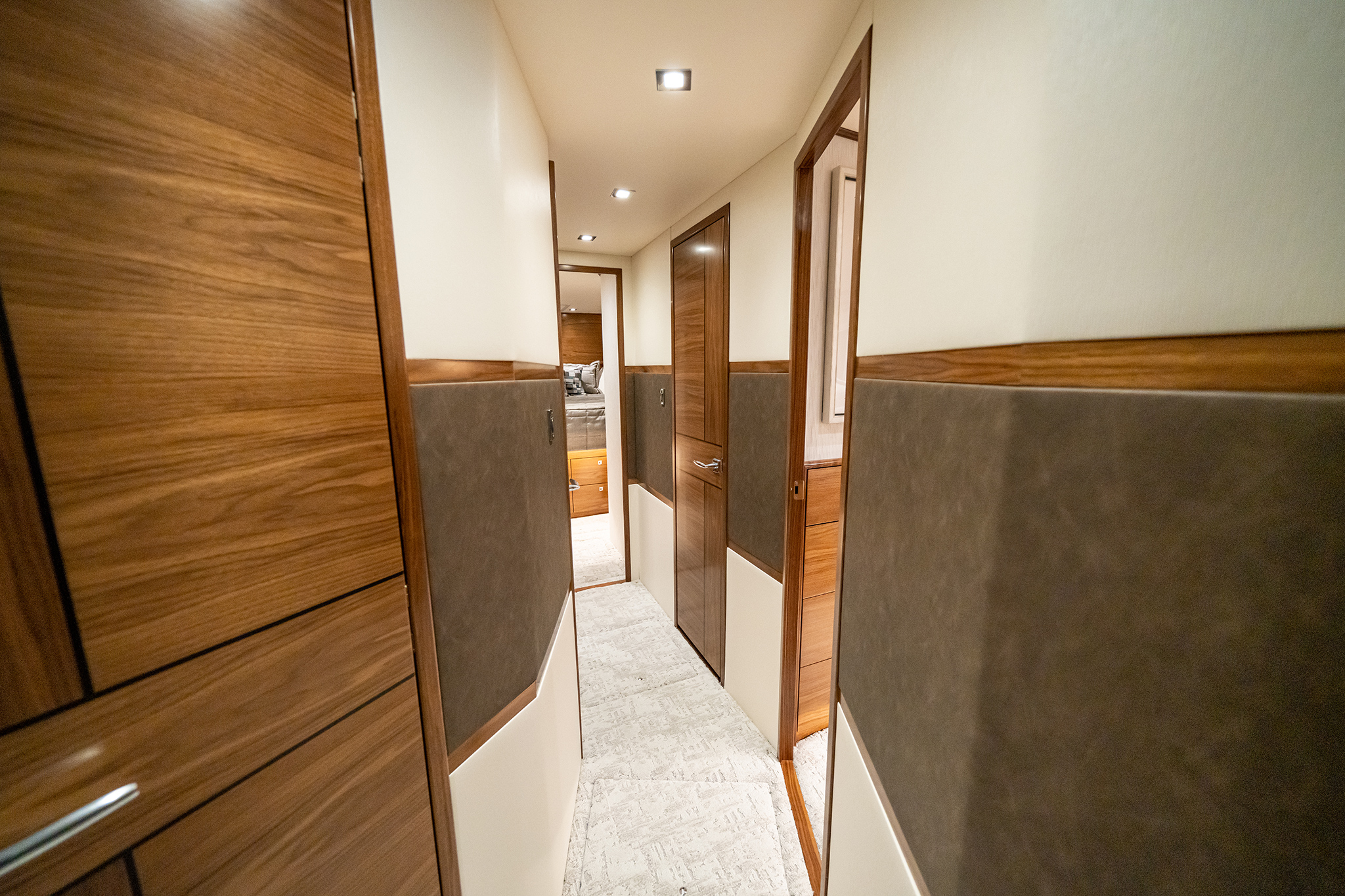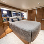 Like the salon, the port-side companionway and four staterooms feature premium carpeting, air conditioning and LED lighting. The companionway is home to a convenient washer and dryer behind a walnut door. The master and forward staterooms each feature queen-size walk-around berths with custom inner-spring mattresses with ample storage underneath, HD TVs and ensuite heads. A crossover berth arrangement is also available in the forward cabin as an option. To starboard you’ll find the spacious midship master, appointed with his-and-hers maple-lined hanging lockers, a credenza, end tables on each side of the bed and an HD TV. The forward guest stateroom forward also provides hanging locker storage, as well as cabinets on the port and starboard sides of the bed and a Bomar foredeck hatch.