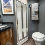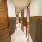 Both the master and guest heads boast Amtico flooring, LED lighting, upper and lower vanities (with the latter featuring a curved walnut face), an engineered stone countertop and a walk-in shower with satin nickel fixtures.