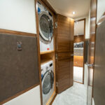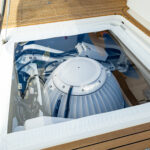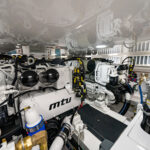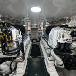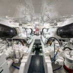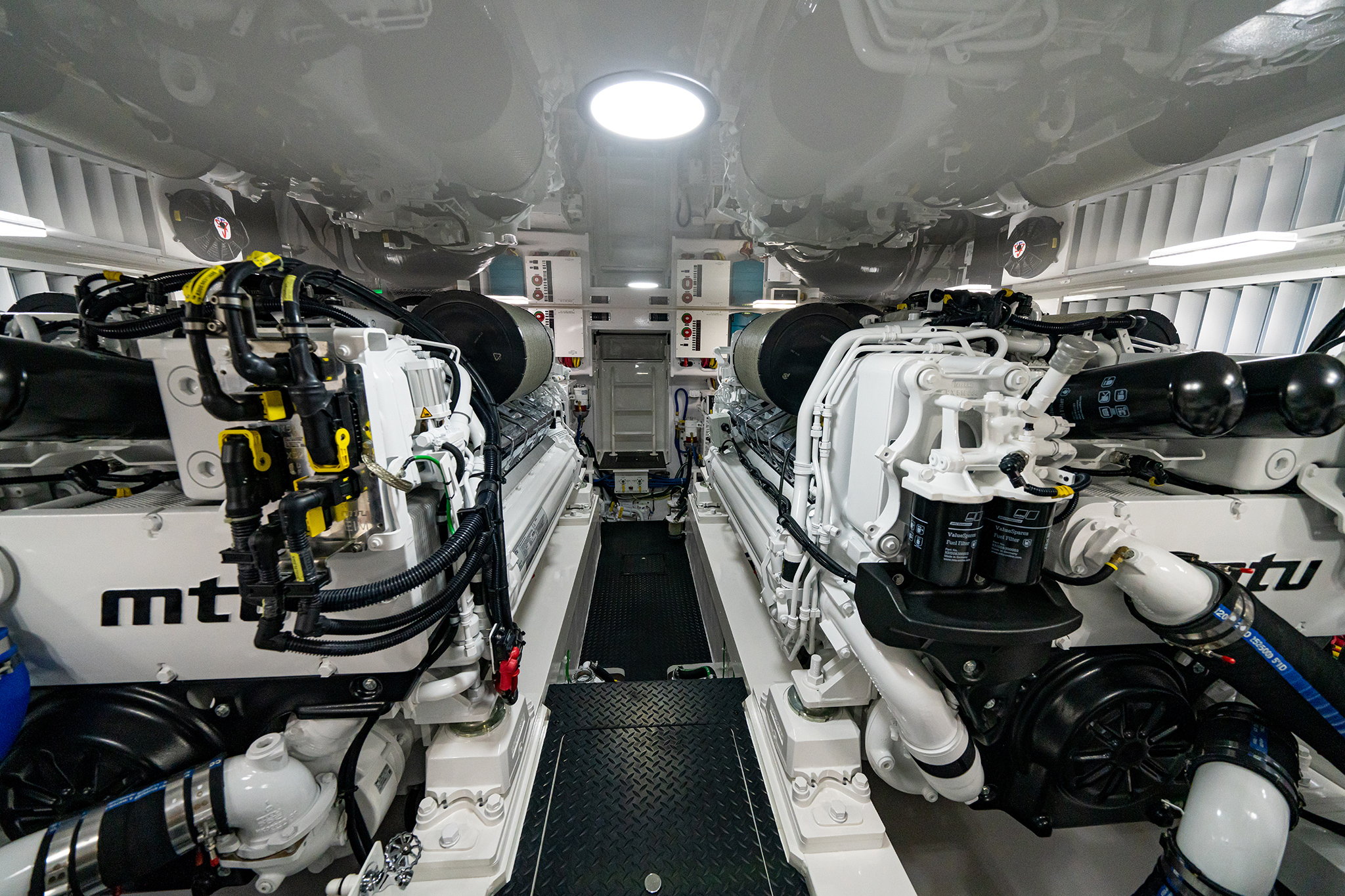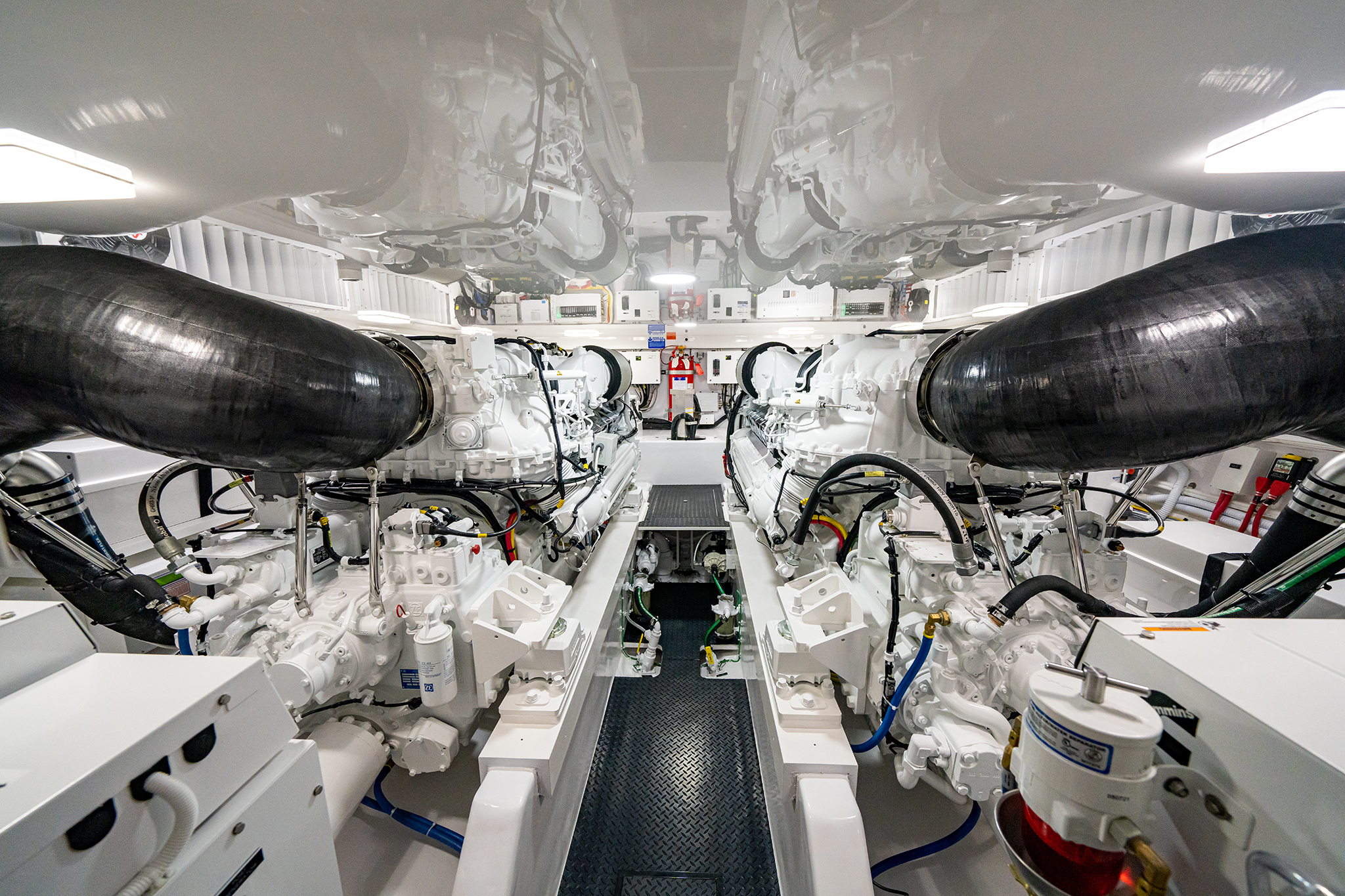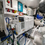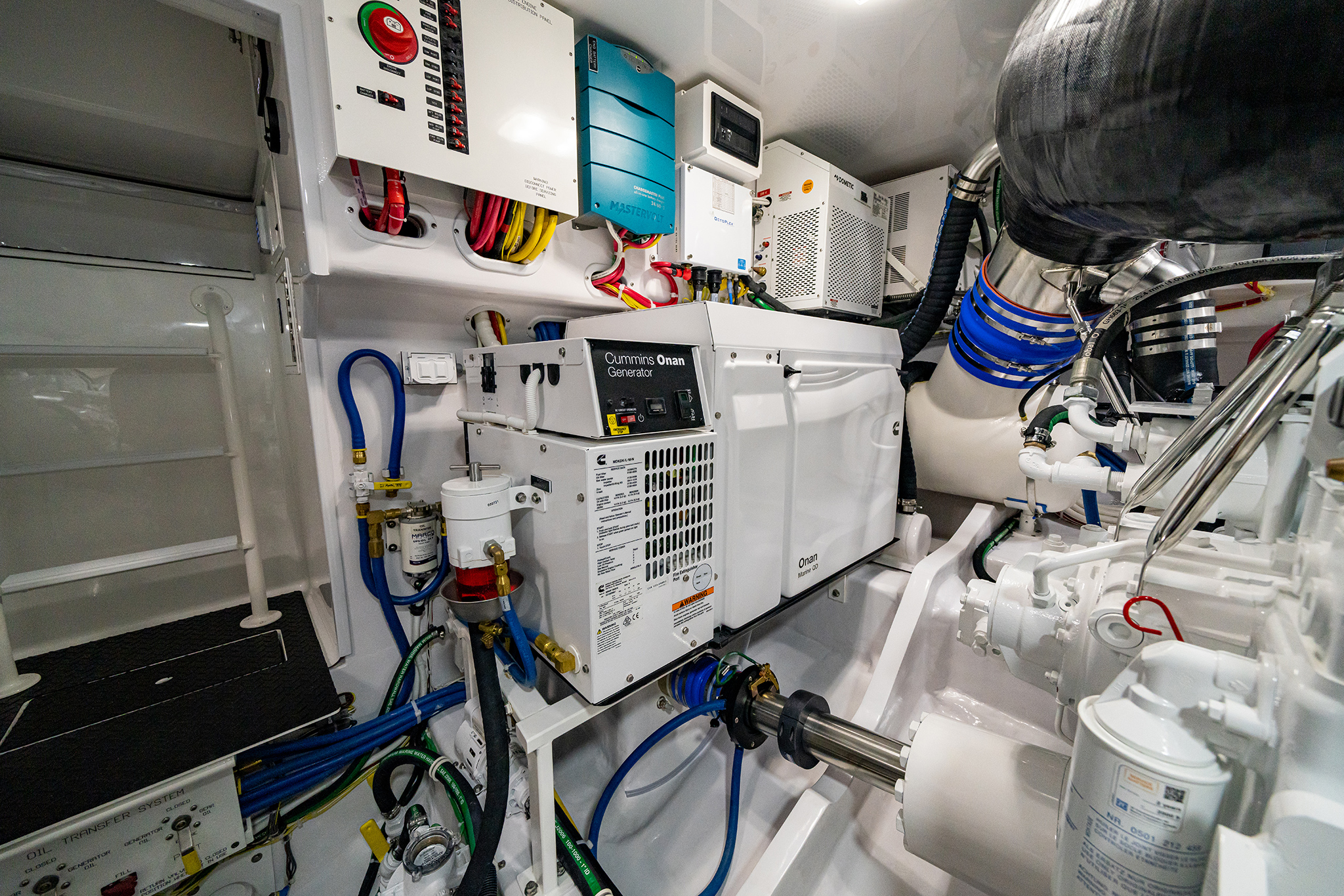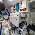 The engineroom, lazarette, forward bilge and anchor locker are coated with Snow White Awlgrip, a highly durable urethane, for visibility and easier maintenance. The engineroom houses numerous mechanical systems with superior performance and durability, including engineroom ventilation, fire suppression and oil changing systems. Batteries are expertly mounted in custom fiberglass storage boxes, and the engineroom is also home to a pair of battery chargers and an Onan 21.5 kW E-QD (electronic quiet diesel) Series genset with an option for a second.