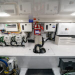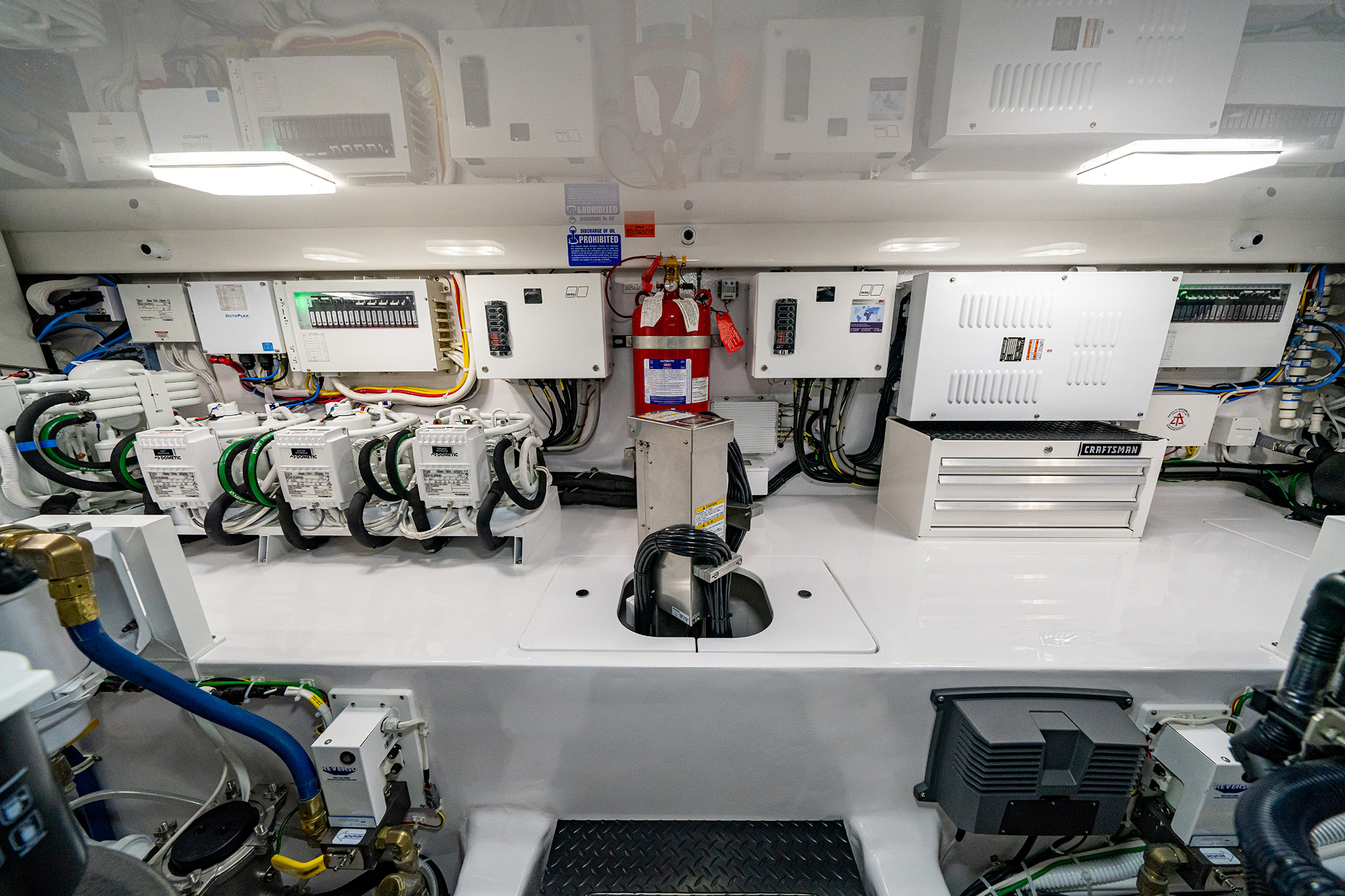 Control of the electrical systems is easily managed, with conveniently located distribution panels in the salon and galley equipped with simple-to-use and clearly labeled conventional switches. In the engineroom, a series of dedicated pumps for the air conditioning, live wells, washdown and other seawater-fed components have been designed, engineered and installed for durability and longevity.