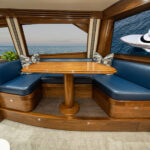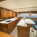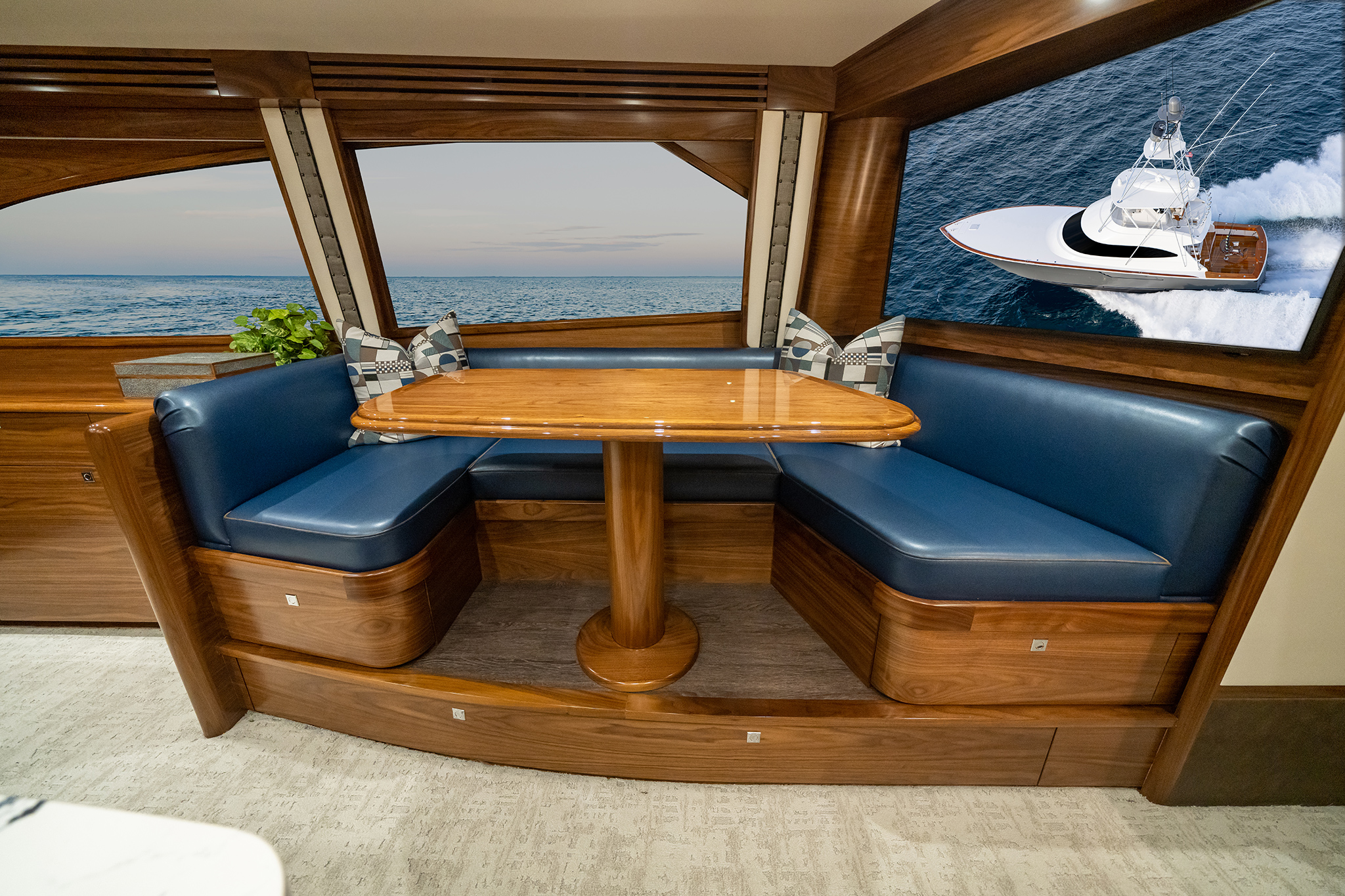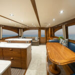 The port-side dinette comfortably seats four adults. It sits on a raised platform that provides rod storage underneath while also enhancing the view out the tinted salon windows. The dinette faces the feature-packed starboard-side galley with walnut cabinetry, custom Amtico flooring and engineered stone counters (with an overhang that creates a bar area with two stools). Under-counter Sub-Zero refrigerator (2) and freezer (1) units with deep pull-out drawers, walnut cabinetry, a four-burner cooktop and a microwave/convection oven are just a few of the galley’s standard amenities.