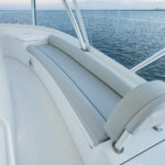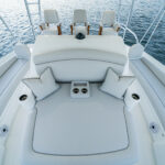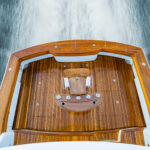 The hull is built with an engineered composite of fiberglass fabrics and coring that’s vacuum-infused with vinylester resin. Great stiffness and strength is brought to the structure while minimizing weight utilizing a calculated resin-to-fiberglass ratio. The structural bulkheads and fuel tanks (which are customized to the shape of the hull) are also resin infused, and the hull-to-deck is through-bolted every three inches and fiberglassed from inside for a rock-solid union.