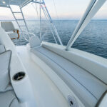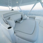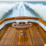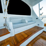The flybridge mirrors other new generation Vikings with a space-saving streamlined walk-around center console. The beautifully crafted fiberglass module neatly holds a recessed black acrylic panel for flush-mounted all-glass electronics displays. The helm is also equipped with Bocatech switching, recessed radio boxes with split lids, a custom helm pod with single-lever electronic controls, stainless steel steering wheel, trim tab switches and electronic trolling valves. The flybridge layout makes excellent use of space, providing a variety and abundance of seating and storage. In addition to the helm and two companion pedestal chairs, there’s lounge seating to port and starboard with storage below. A third two-person lounge with fold-down armrests (and massive freezer beneath it) is integrated into the console’s forward end. It’s a great place to put your feet up and enjoy the ride home from the canyons. Nested in the four corners of the flybridge are more smart storage solutions, including a sink and a refrigerated drink box.