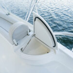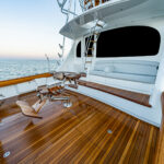 The observation mezzanine is designed to keep guests cool and dry thanks to the flybridge overhang, as well as clear of the crew working in the cockpit. For those in warm climates, we offer mezzanine air conditioning. To starboard, freezer and cooler space is provided under the mezzanine seating. A centerline hatch opens with stainless steel gas pistons for excellent access to the engineroom. The port side holds more cooler storage and a tackle cabinet with drawers.