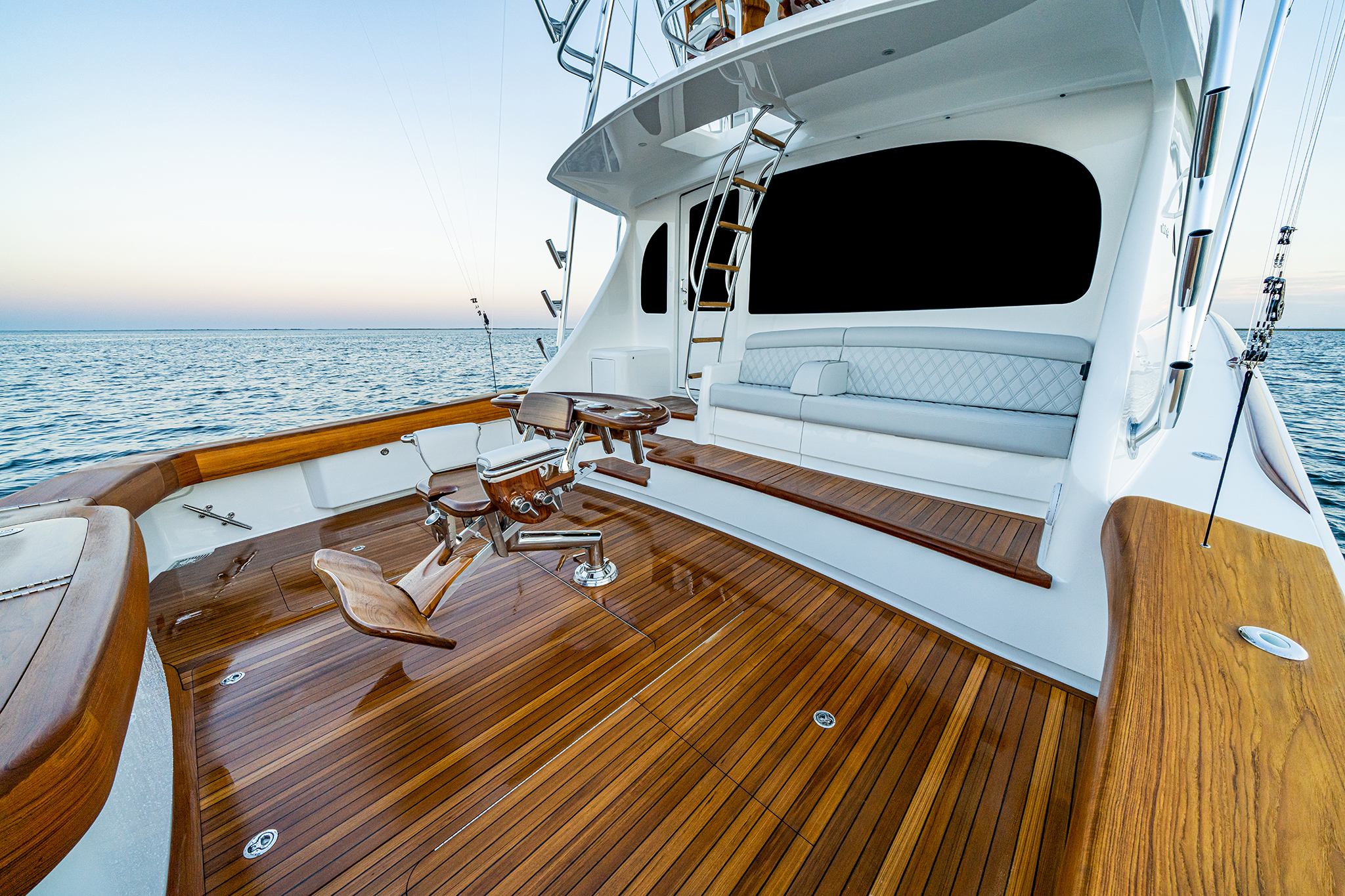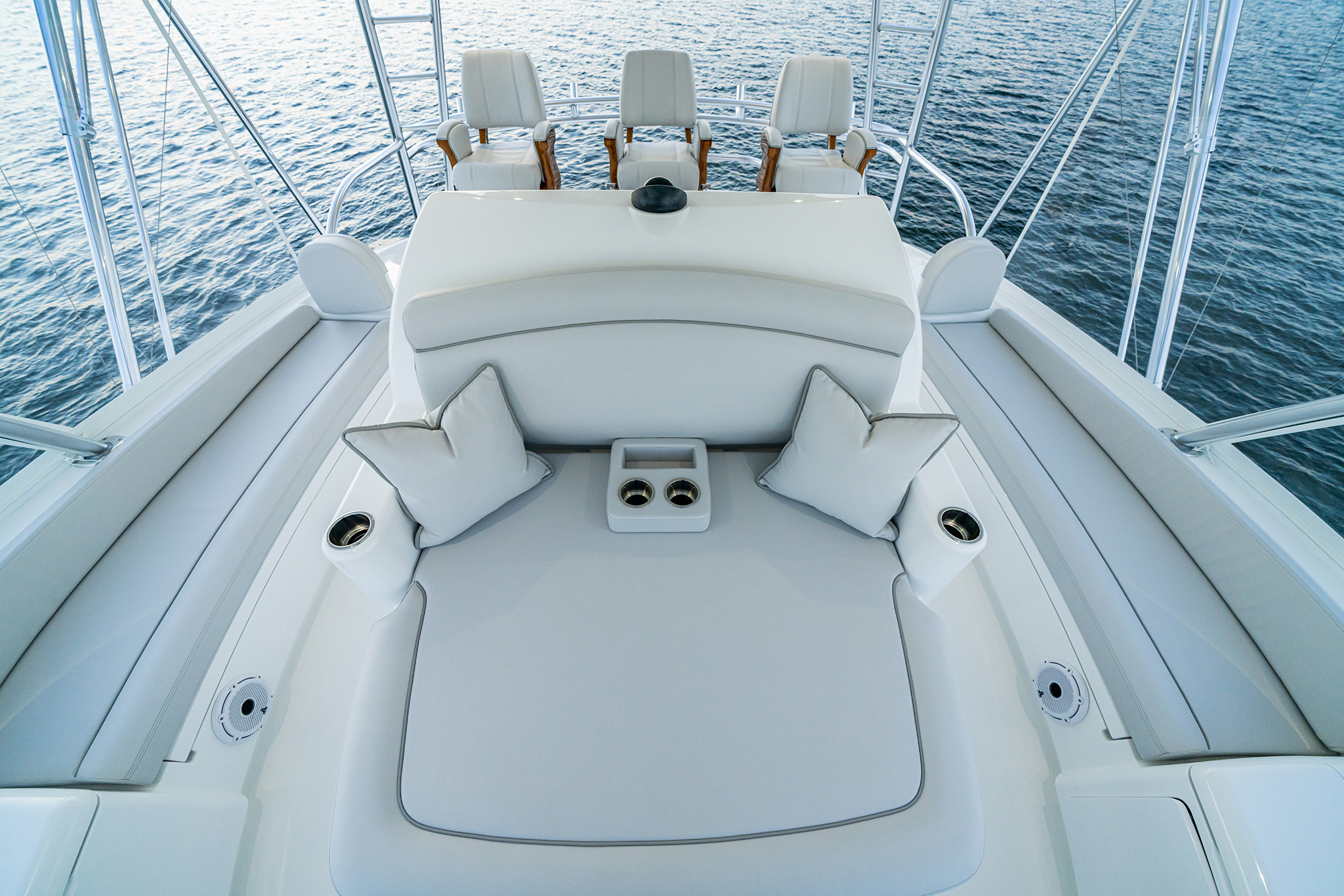 The result of thousands of hours on the tournament trail, the 180-square-foot cockpit is clean, streamlined and maximizes freedom of movement, with easy access to storage and service areas. Standard equipment is substantial. Flush rod holders; fresh and raw-water wash down systems; transom fish box with live well, rounded coamings with indirect rope lighting below; side lockers for tag stick and gaff storage; quick disconnect fitting for oil changes for the engines, transmissions and generator; port and starboard in-deck insulated fish and stowage boxes and optional in-deck live well; and stereo speakers are all part of the package. The centerline lazarette hatch (available with power actuation) opens nearly 90 degrees for full viewability and access to the available Seakeeper 26 as well as the steering, trim tabs and drain pumps. An aluminum backing plate is laminated into the cockpit sole for a fighting chair, rocket launcher or table.