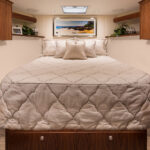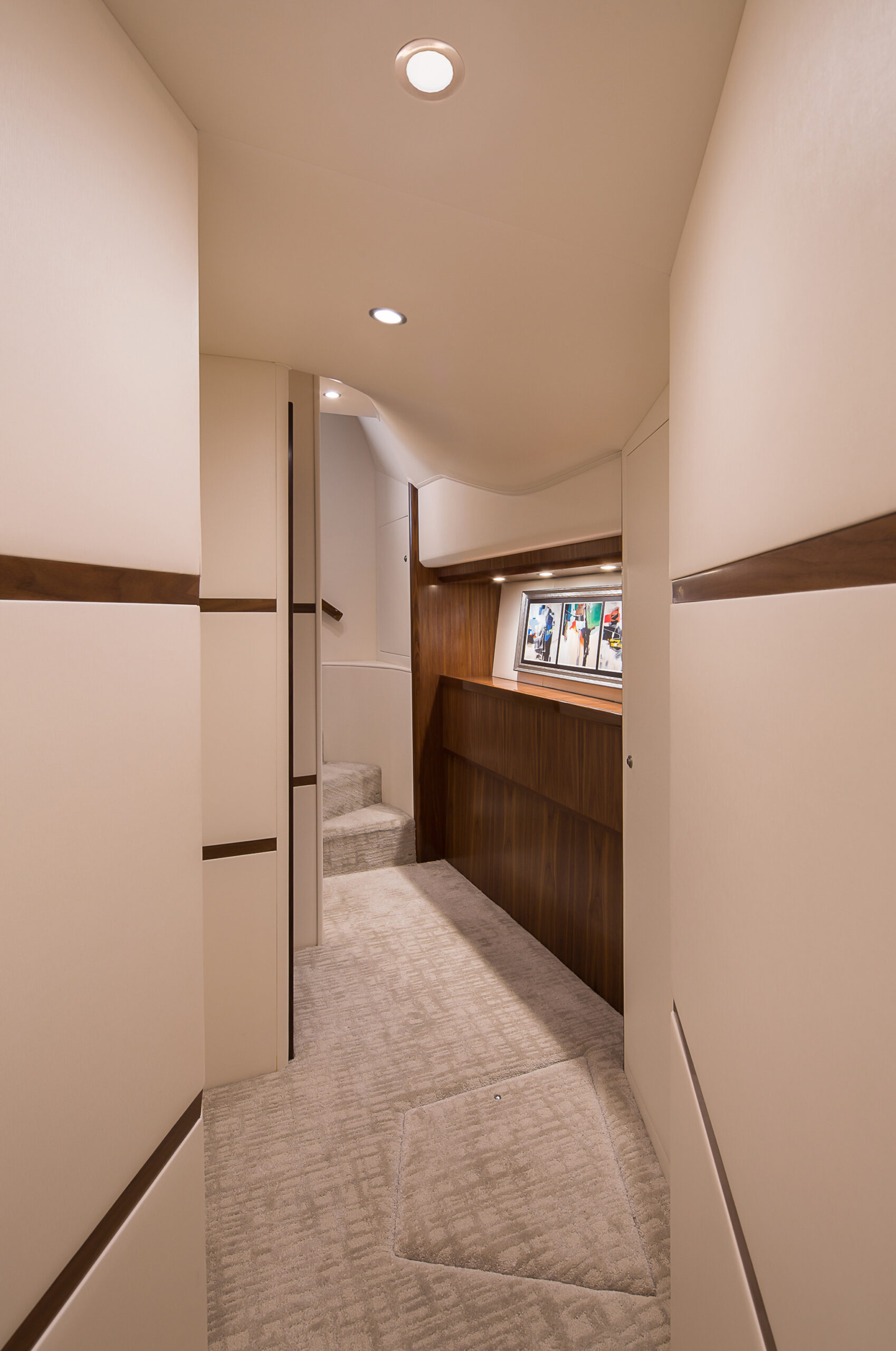 Step inside the deckhouse and enter a world of luxury, comfort, convenience and smart storage solutions. The four-stateroom, four-head arrangement is sure to please the most fastidious yachtsman as well as the most particular tournament fishermen. A high-gloss walnut finish decorates the entire interior, and the salon is a blueprint of intelligent form and function, utilizing the wide beam to its maximum potential.