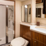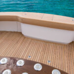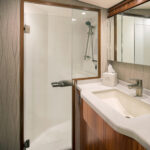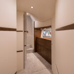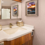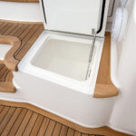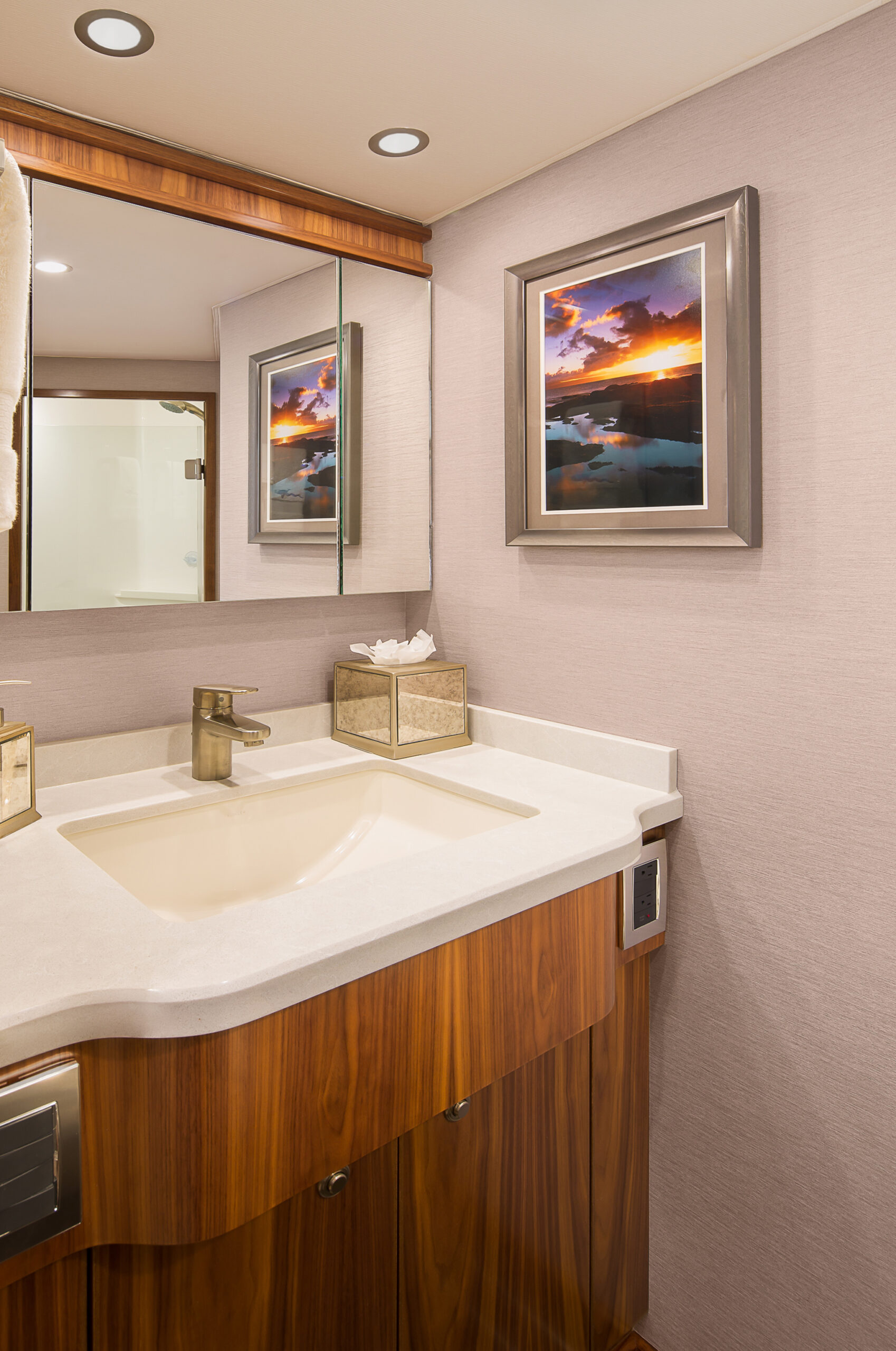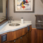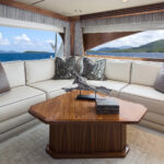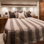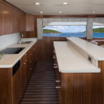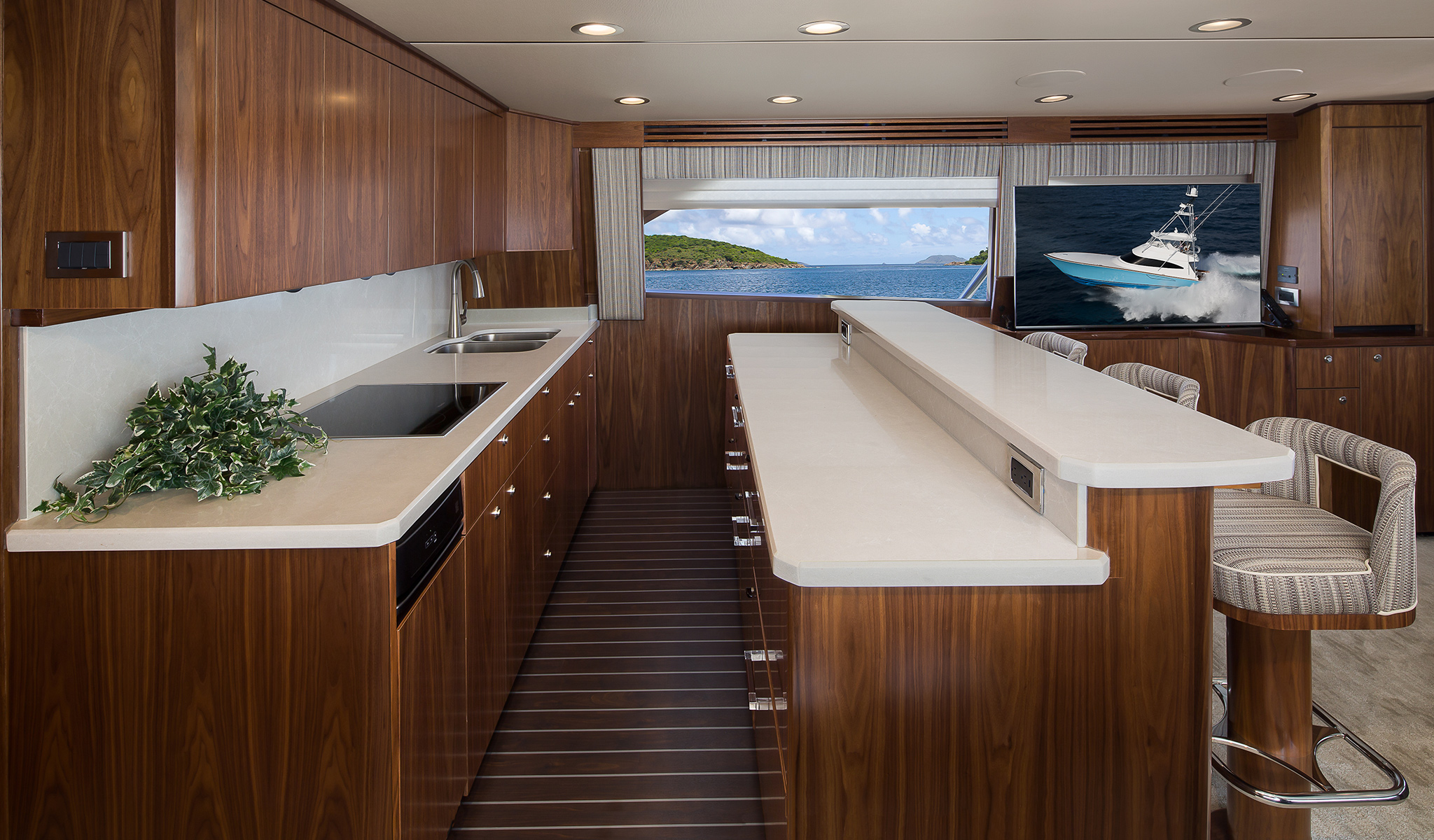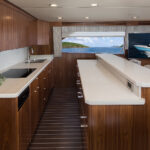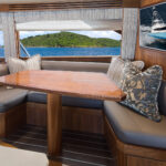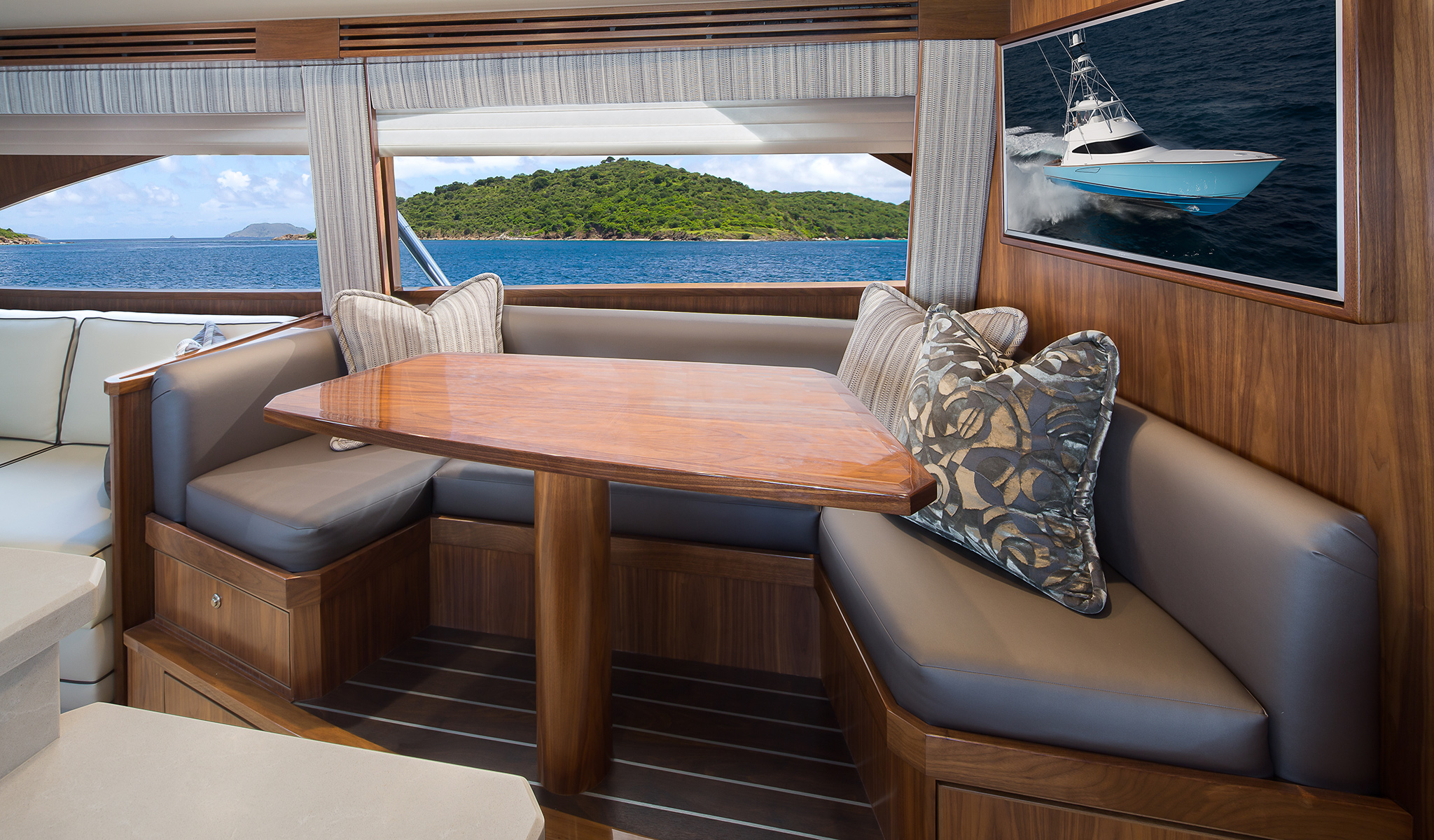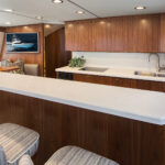 Open to the salon, the 68 C’s walk-around island galley maximizes space while serving as a prime socializing area that’s loaded with modern conveniences, including Sub-Zero under- counter refrigeration, and pull-out drawers on aircraft-type slide mechanisms that lock in place for safe keeping. Opposite the galley, a large dinette easily accommodates four adults for dinner and additional bar-stool seating is available at the island galley counter.