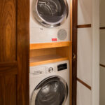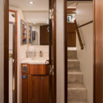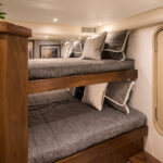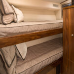 The forward stateroom has a walkaround queen size bed that lifts to reveal a cavernous stowage compartment below. The starboard and crew staterooms feature upper and lower berths and each is served with a private head and stall shower. The crew quarters are discretely located, accessed via a separate set of steps off the companionway.