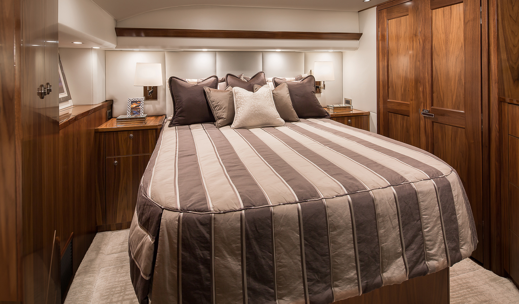 With a layout that puts the companionway to port, the starboard master stateroom “is nearly the full beam of the boat, which means you have the space for convenient storage areas such as his-and-her hanging lockers and credenzas,” says David. “This is a convenience that’s a difference-maker, one that owners love.” The master includes a queen-size walkaround bed a maple-lined hanging closet with walnut doors, 32-inch HD TV and ensuite head with separate shower.