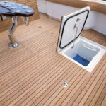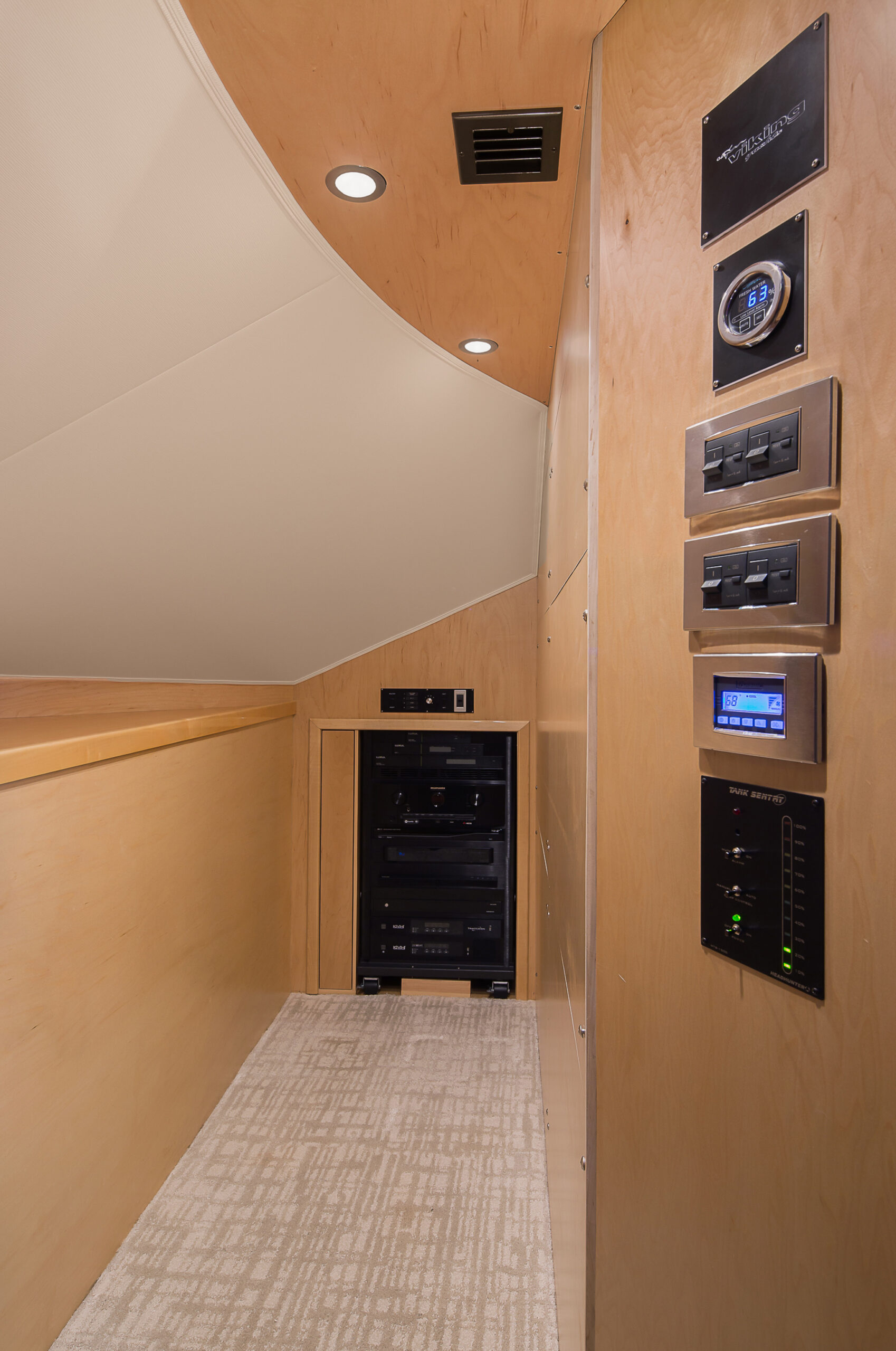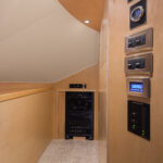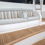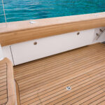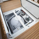 Frameless windows fill the spacious salon with an abundance of natural lighting. Air conditioning flows from hidden registers behind valances to better distribute cooling air and reduce noise. We’ve placed the electrical panel directly inside the companionway door at eye level for quick access and operation.