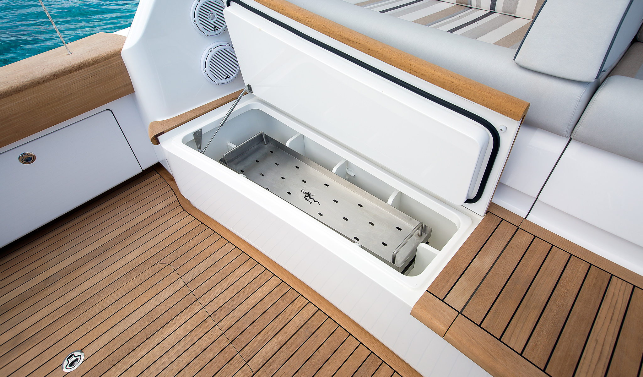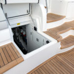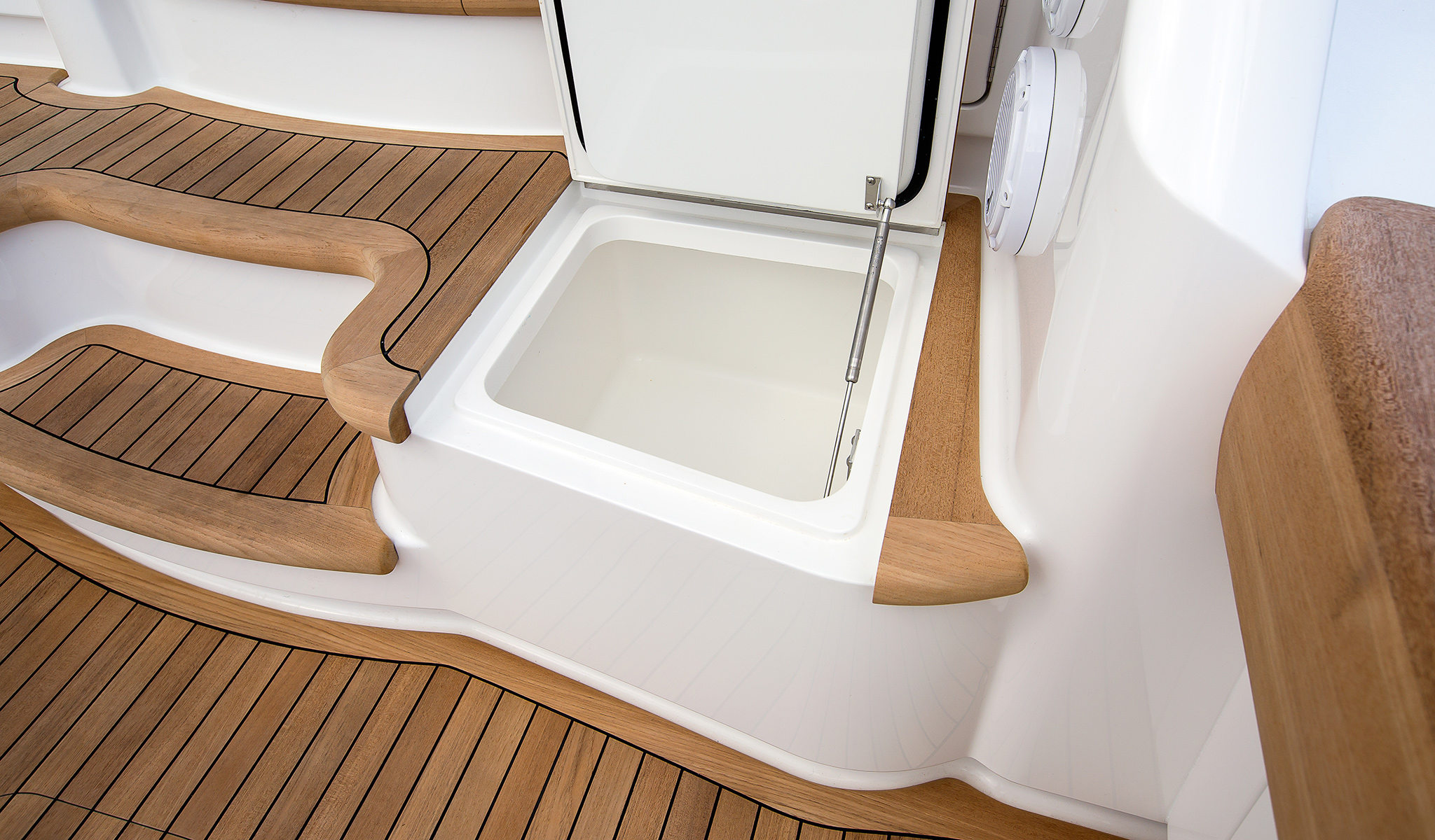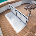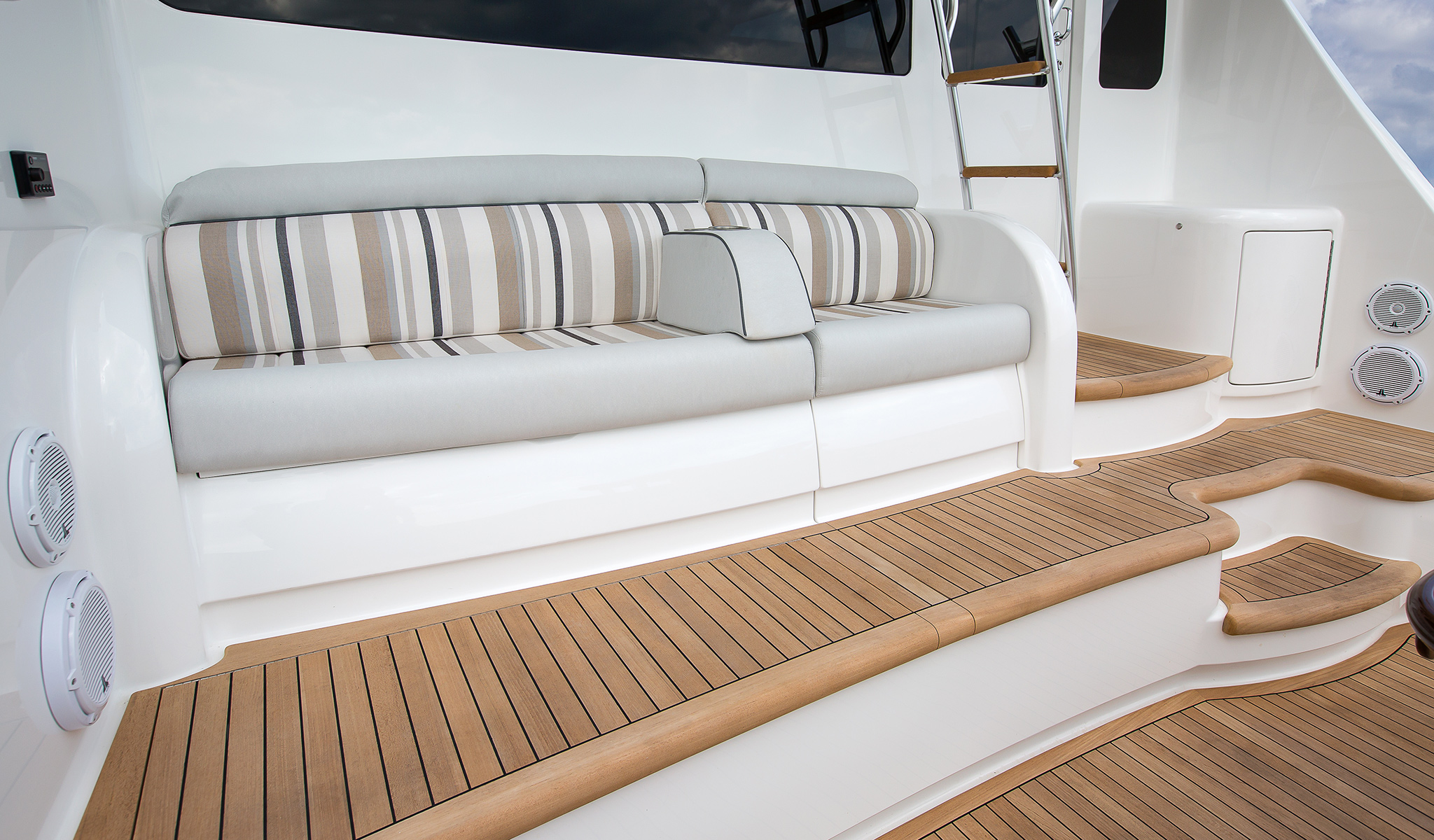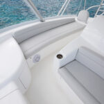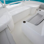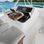 Observation mezzanine with port aft facing lounge seating with Sunbrella-covered cushions, hinged seats, tackle cabinet with pullout drawers and bait freezer. Standard amenities in the cockpit also include a one-piece anodized aluminum ladder to the bridge, rounded coamings, recessed stainless-steel hardware, a stereo and speakers, a large lazarette hatch, fresh and saltwater washdown systems, a refrigerated chill box in the salon entrance step so you can stay close to the action throughout the day, a walk-through transom door with lift gate, a molded nonslip fiberglass sole with aluminum plate reinforcement for fighting chair placement, flush rod holders, tackle and gaff stowage, in-deck fishwell with a macerator pump discharge and stowage compartments for gear and an available circulating livewell. For dockside versatility, port and starboard Glendinning Cablemaster shore power cords are provided.