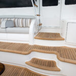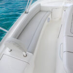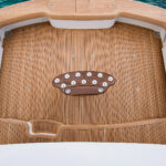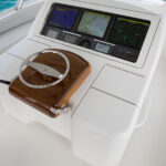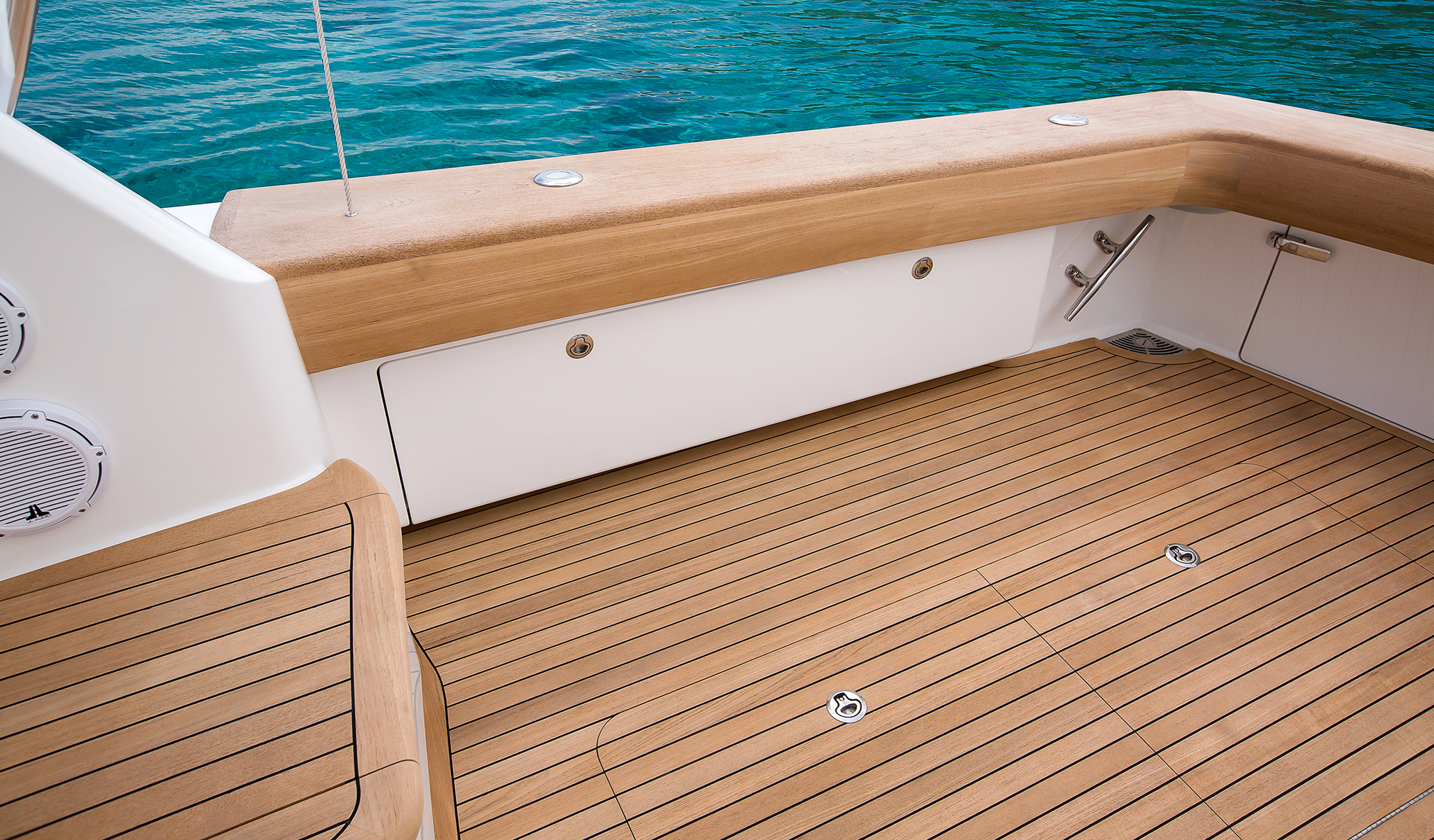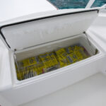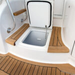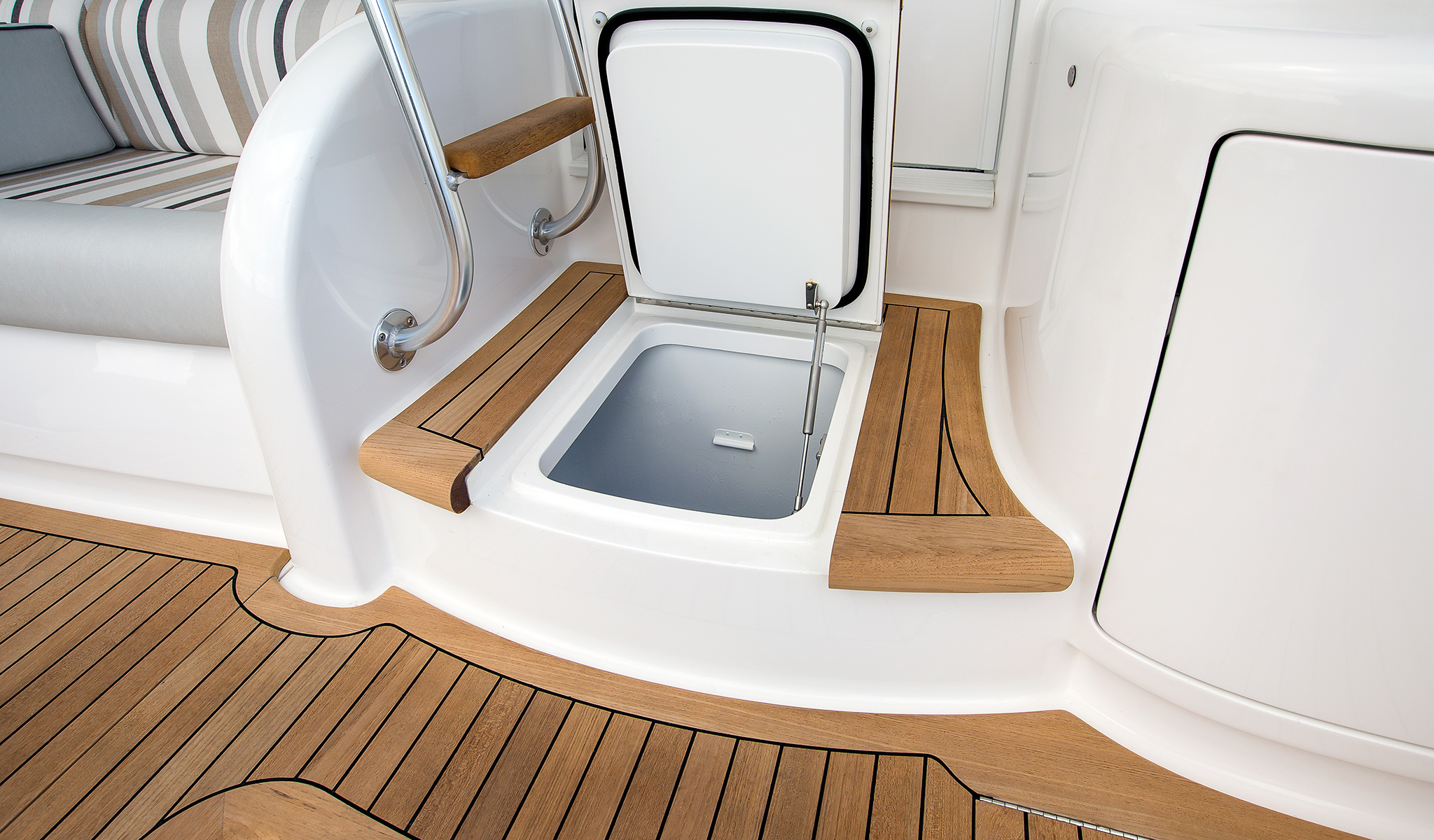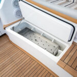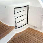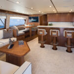 Observation mezzanine with port aft facing lounge seating with Sunbrella-covered cushions, hinged seats, tackle cabinet with pullout drawers and bait freezer. Standard amenities in the cockpit also include a one-piece anodized aluminum ladder to the bridge, rounded coamings, recessed stainless-steel hardware, a stereo and speakers, a large lazarette hatch, fresh and saltwater washdown systems, a refrigerated chill box in the salon entrance step so you can stay close to the action throughout the day, a walk-through transom door with lift gate, a molded nonslip fiberglass sole with aluminum plate reinforcement for fighting chair placement, flush rod holders, tackle and gaff stowage, in-deck fishwell with a macerator pump discharge and stowage compartments for gear and an available circulating livewell. For dockside versatility, port and starboard Glendinning Cablemaster shore power cords are provided.