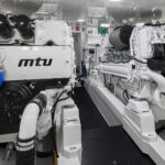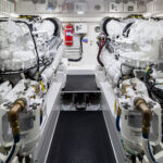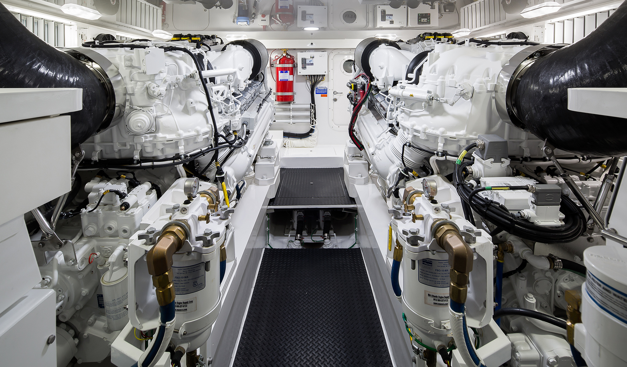The stand-up engineroom features Viking’s leading edge powder-coated web-frame structural-steel engine beds, which are mounted on dedicated transversals for vibration-free, engine and drive train alignment. Standard fuel capacity is 2,060 gallons in Viking-made fiberglass fuel tanks, which are nestled in the hull and fiberglassed into place. The tanks mirror the hull bottom to maximize draw and range and in so doing also contribute to hull strength. If desired, fuel capacity can be increased to 2,423 gallons.