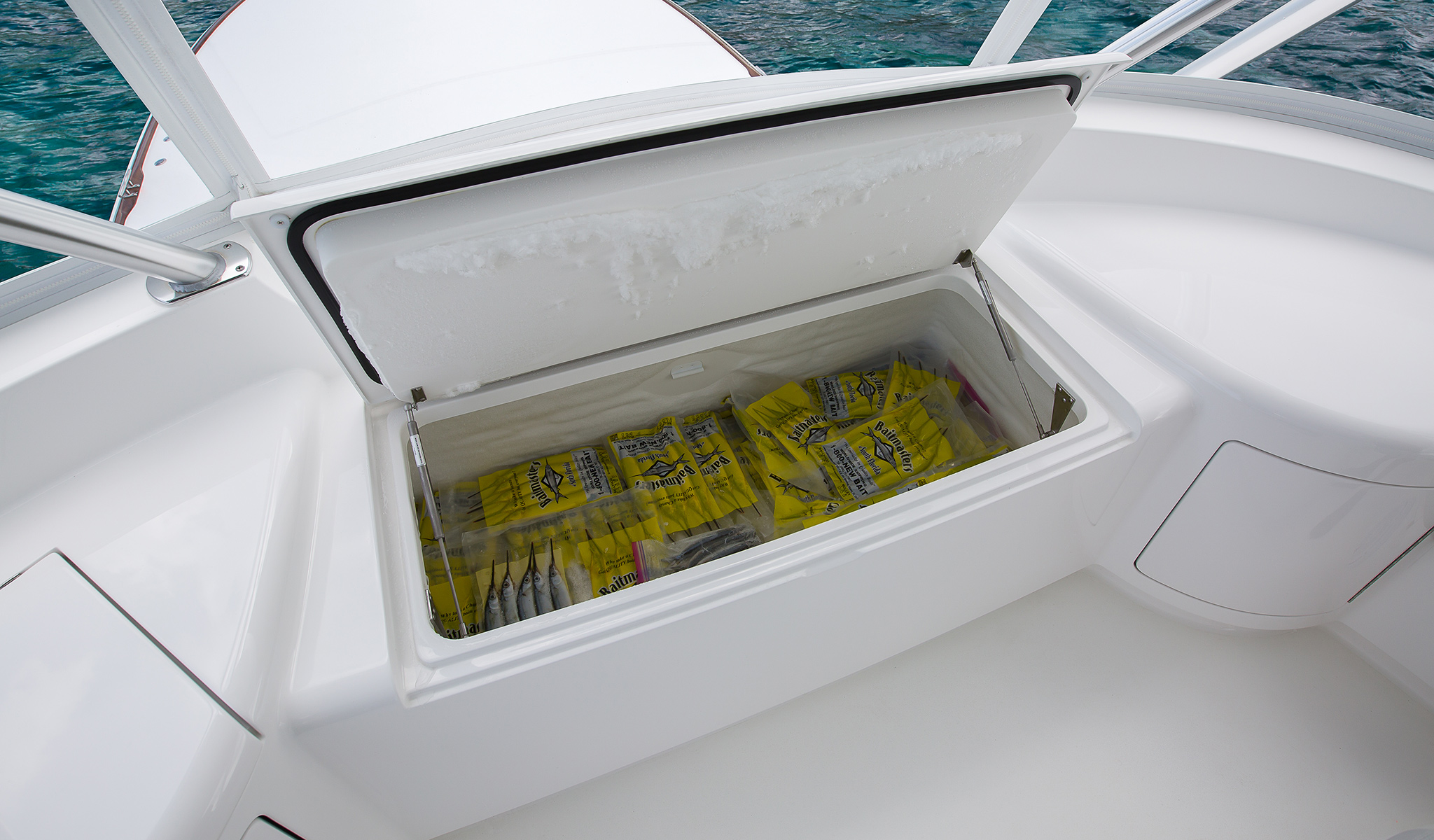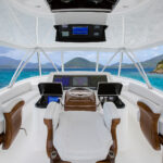 The flying bridge sports a center console helm providing superb visibility to all quarters. Electronic trolling valves allow maximum control on the trolling grounds. Fishing rods stow neatly under port and starboard bench seats, while electronics nest safely beneath a clear acrylic panel on centerline, which keeps them dry in any weather yet always within easy view. Forward of the helm is an additional freezer and bench seat.