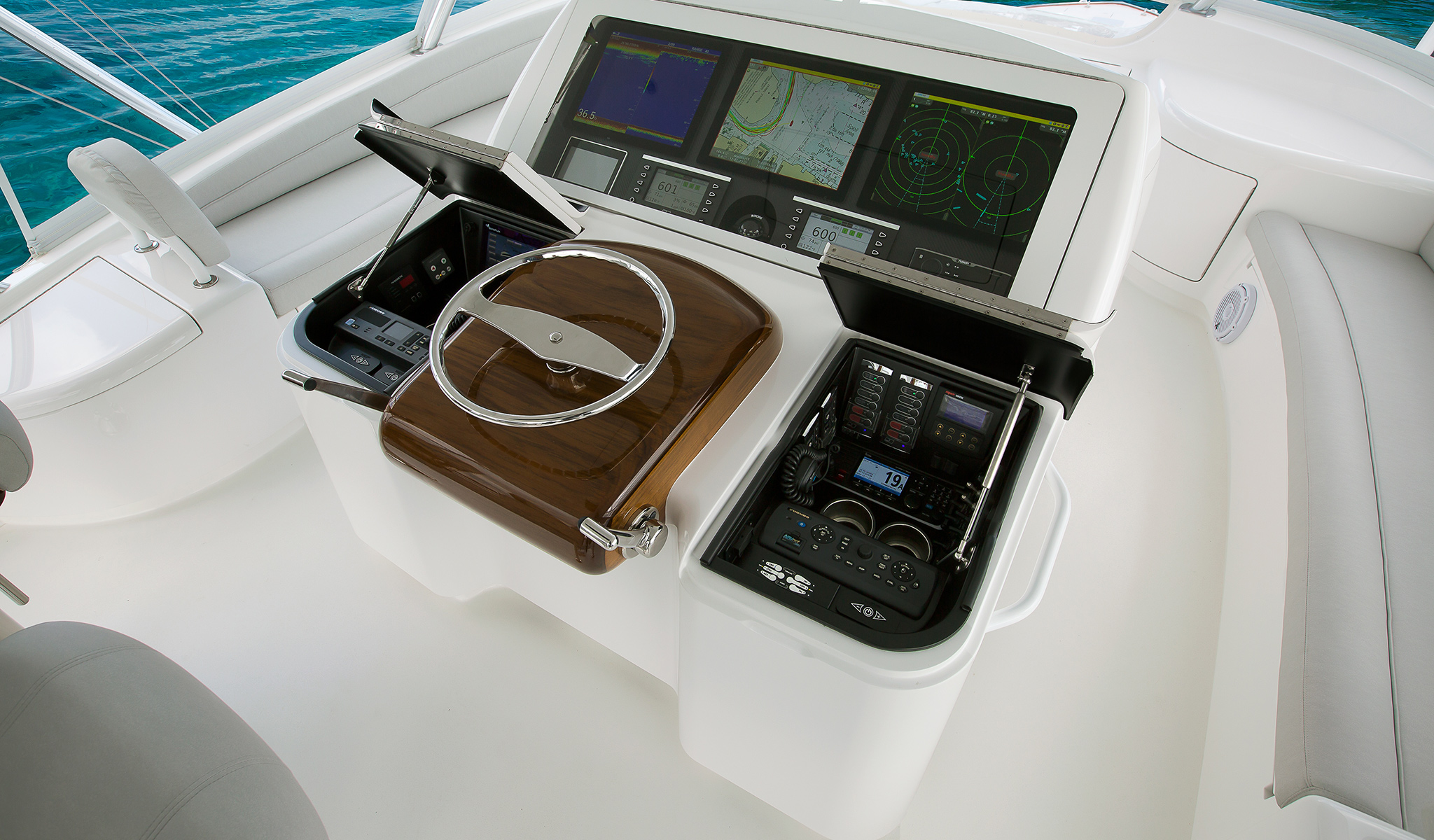 While this proven arrangement is a favorite with tournament fishermen, a climate controlled enclosed bridge with a spiral staircase from the salon also is available, a popular plan with cruising yachtsmen. In addition to providing comfort and convenience, the enclosed bridge serves a second salon and private retreat. The forward control station has all the necessary control switches, lighted instrument and engines controls along with VIPER (Viking Independent Programmable Electro-hydraulic Rudder) steering system. A second station is located on the flying bridge overhang for excellent visibility when docking or fishing.