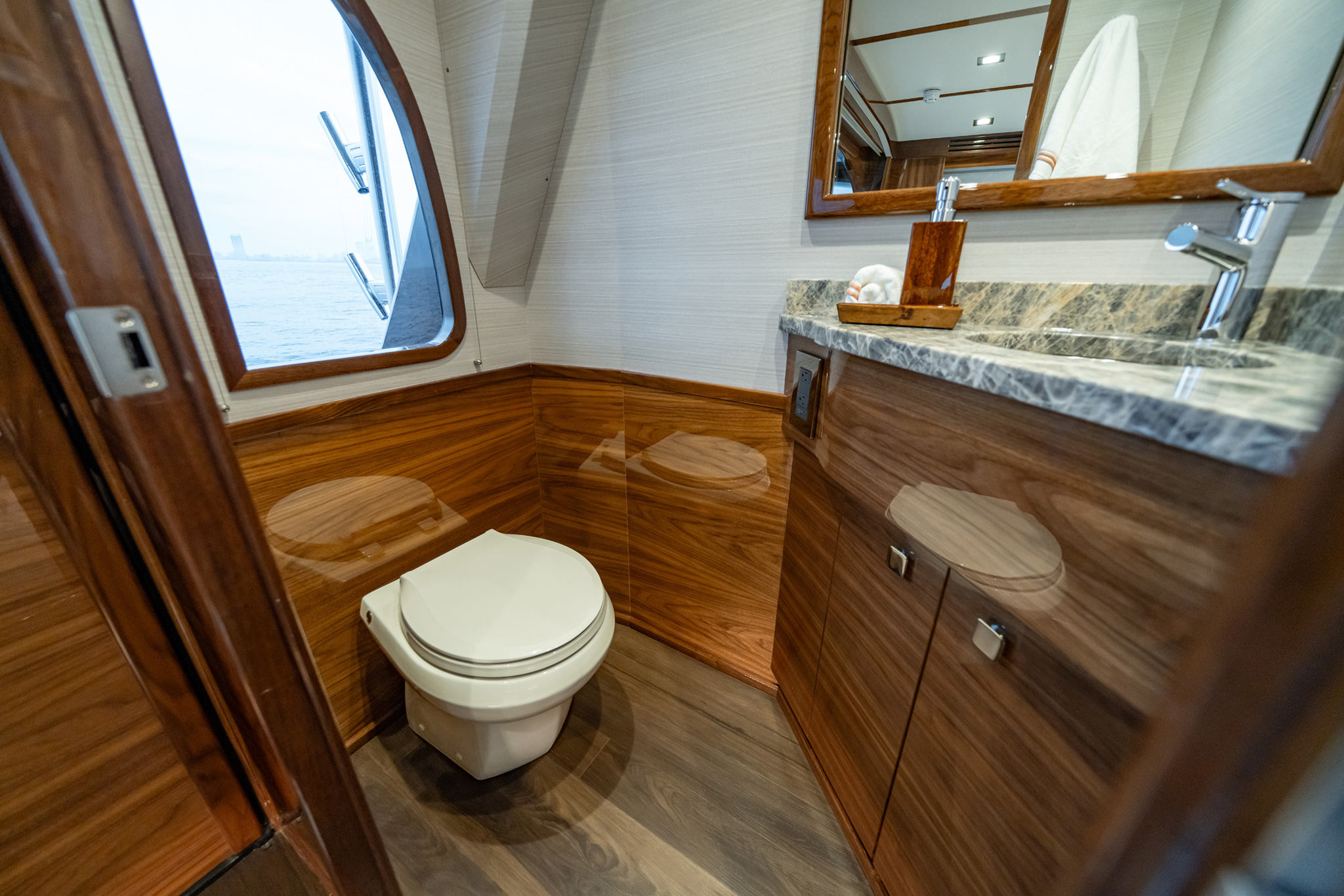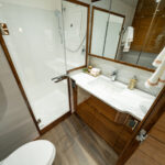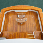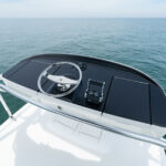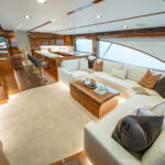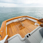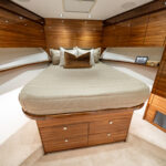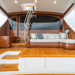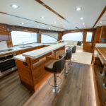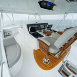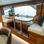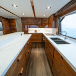 The interior of this amazing yacht features a horizontal-grain natural walnut throughout, available in satin or gloss finishes, and interior doors with horizontal and vertical grains and ebony inlays. Enter the salon from the mezzanine through a port-side electric sliding door. You’ll immediately notice the abundance of natural light pouring in through the shapely salon windows. To port, there’s a convenient day head, making trips below unnecessary during fishing excursions. The open-concept design features three distinct gathering areas with a straight walkway that extends from the salon door to the forepeak, accentuating the sense of depth and space.