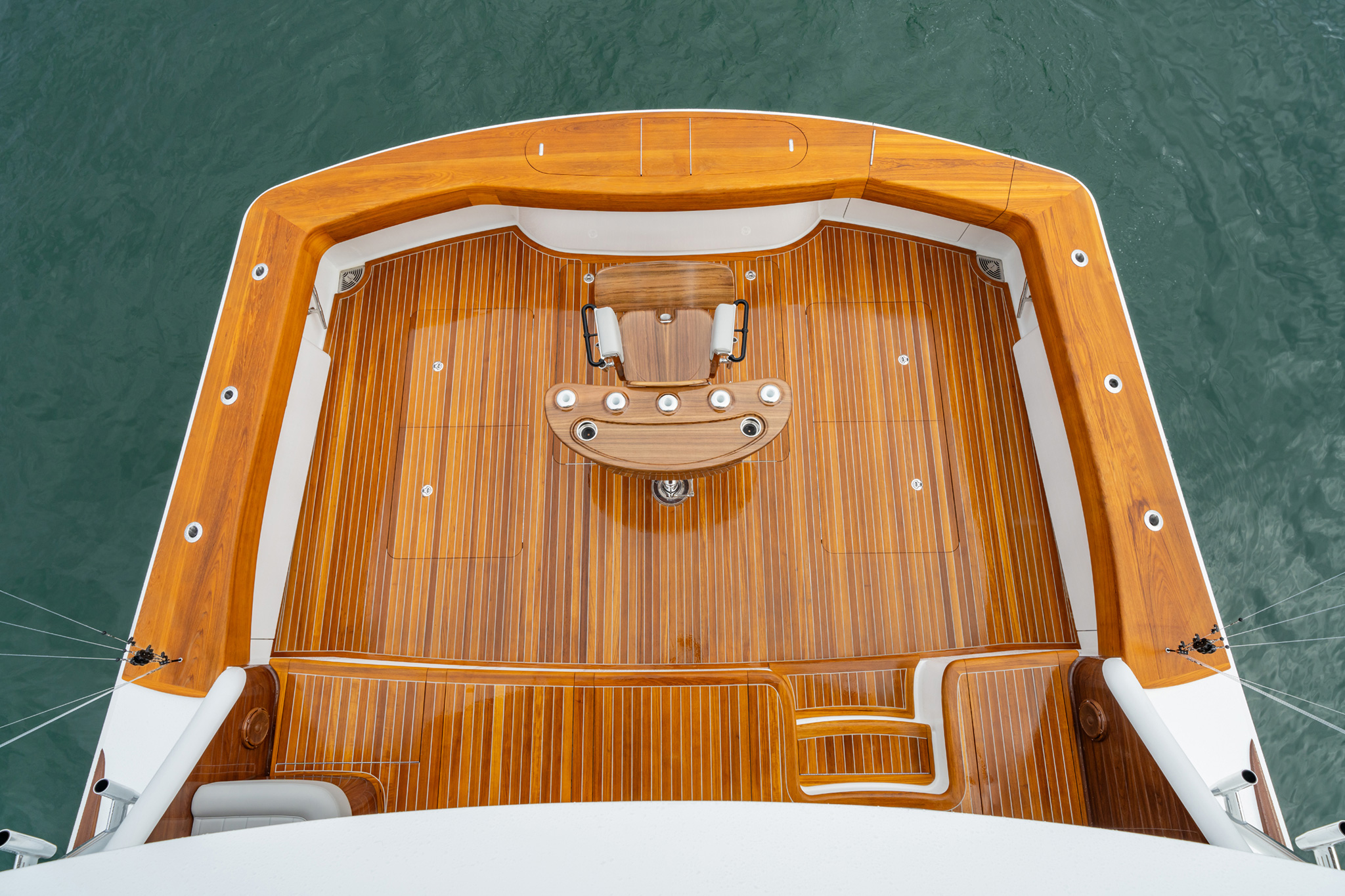 The flybridge, which applies many of the design concepts of the Viking 90, is anchored by a walkaround center console with a full-width helm platform that accommodates three Release Marine helm chairs with teak ladder backs. The 8-inch-high platform offers 360-degree visibility, a clear view of the cockpit deck and excellent access to all instrumentation. The console’s recessed black acrylic dash holds four 17-inch multifunction displays (MFD). The clean, streamlined and operator-friendly helm also features dual radio boxes with split lids housing instrumentation and controls, a teak helm pod, single lever electronic controls and a stainless steel steering wheel. Air conditioning can be added to the helm, as well. Hull No. 1 will feature a custom navigation, communication, fishfinding and entertainment package from Atlantic Marine Electronics, also a Viking company.