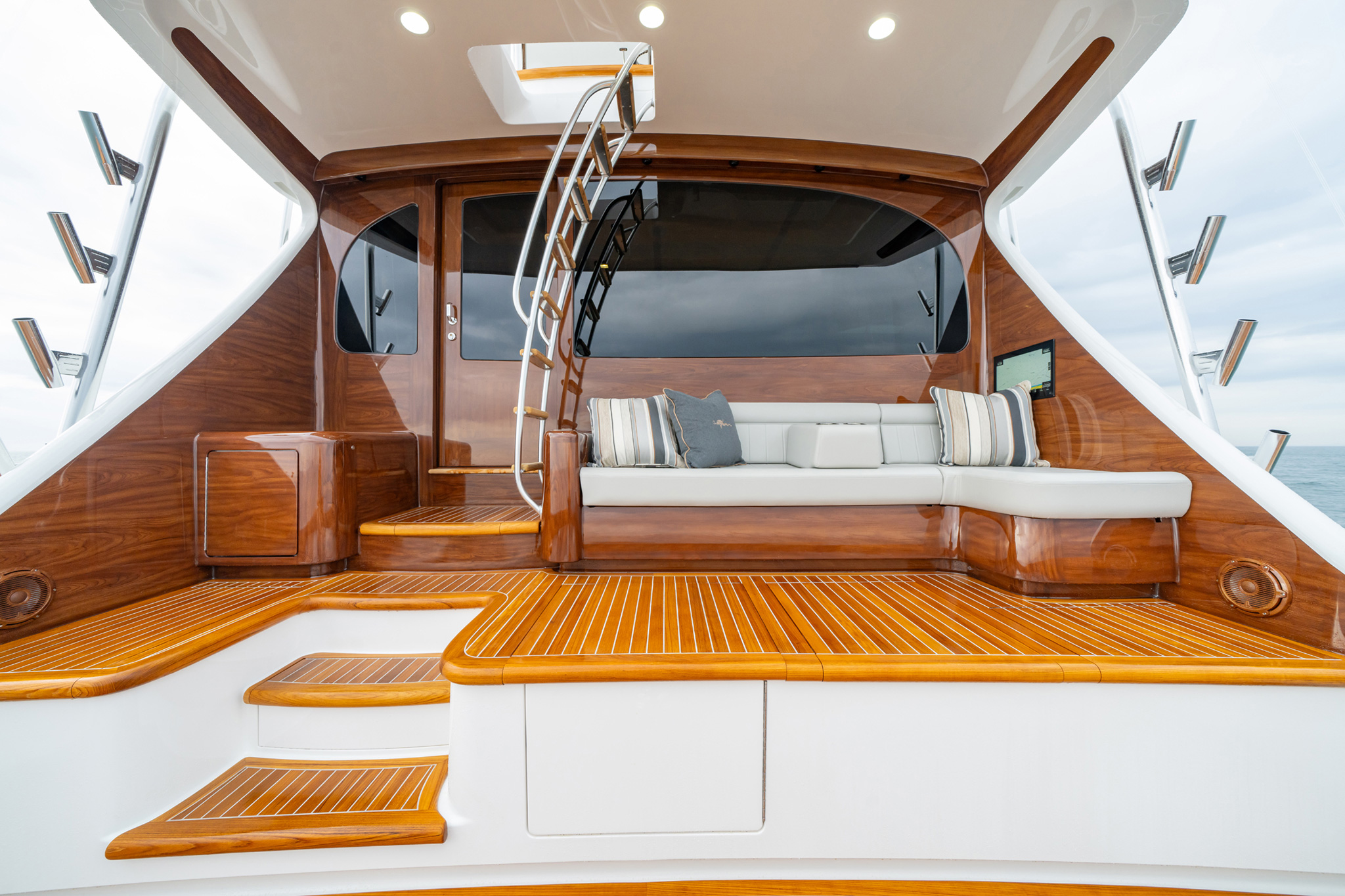 To starboard, a wraparound sofa – with storage below and accompanied by a walnut hi-lo table – provides an excellent view of the large port-side HDTV, which rises from the entertainment center cabinetry. Forward on the port side, the dinette easily accommodates five with plush seating and a walnut table. The dinette sits on raised platform, giving guests an excellent view outside while providing rod storage in a pull-out drawer below.