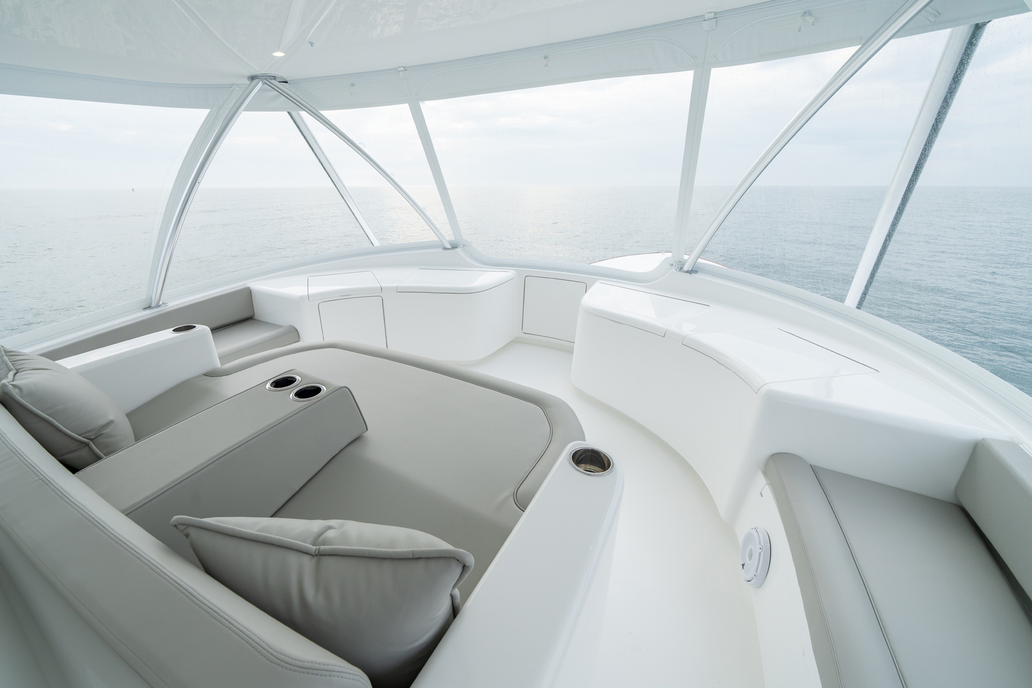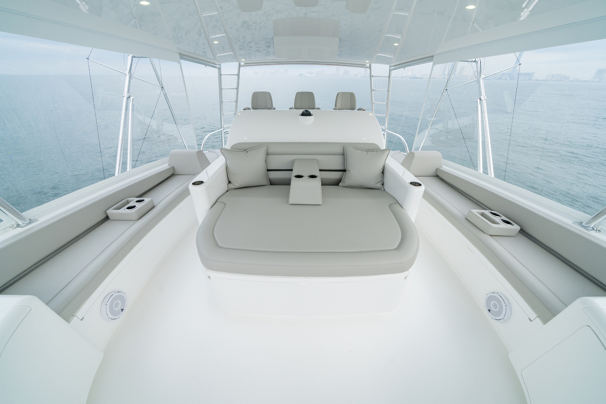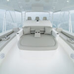 The 82’s center console features an integrated full-length forward lounge with standard air conditioning in the backrest and storage underneath that’s available as an optional freezer. Dual freezers forward allow you to store different baits separately. The forward flybridge is also home to a convenient sink and refrigerated drink box. Seating modules to port and starboard each hold back-to-back lounges that share a backrest.