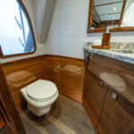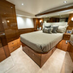 All staterooms include their own ensuite head with separate shower. The VIP stateroom forward and the guest cabin aft are both appointed with walk-around queen beds. A guest and crew stateroom are on the port side, each with upper and lower berths. The crew stateroom is immediately adjacent to the rod and tackle locker.