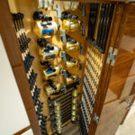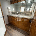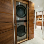 The Viking 82’s larger size can also be seen in the forepeak, where you’ll find five generously appointed staterooms and additional space in the companionway for a dedicated rod and tackle locker as well as a laundry center. The latter features a full-size stackable washer and dryer with centralized control panel for easy operation. The rod and tackle locker can be customized to the owner’s liking. Beautiful walnut doors conceal both of these spaces.