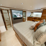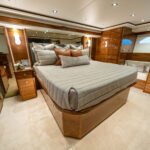 The full-beam midship master stateroom is accessed via a private staircase off the companionway. This royally appointed suite boasts a king-size walk-around bed, end tables and an HDTV. Overhead LED lighting with dimmers, decorative indirect rope lighting and an upholstered headboard accent the space. Other highlights: port and starboard maple-lined hanging closets and credenzas, a vanity/desk area with stool to starboard and a seating area to port. The expansive head includes twin sinks with seven drawers of storage below, a large walk-in shower and an optional mirrored ceiling.