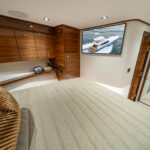 If you like the salon-like features of an enclosed bridge but also want to run the boat from an open bridge occasionally, the 82’s sky bridge model is for you, providing the best of both worlds. The elevated bridge’s port-side console has a fully equipped helm with a recessed black acrylic panel for flush-mounted MFDs. Guests can enjoy the view from a forward L-shaped lounge (with underneath storage), with easy access to a forward refrigerated drink box and a sink.