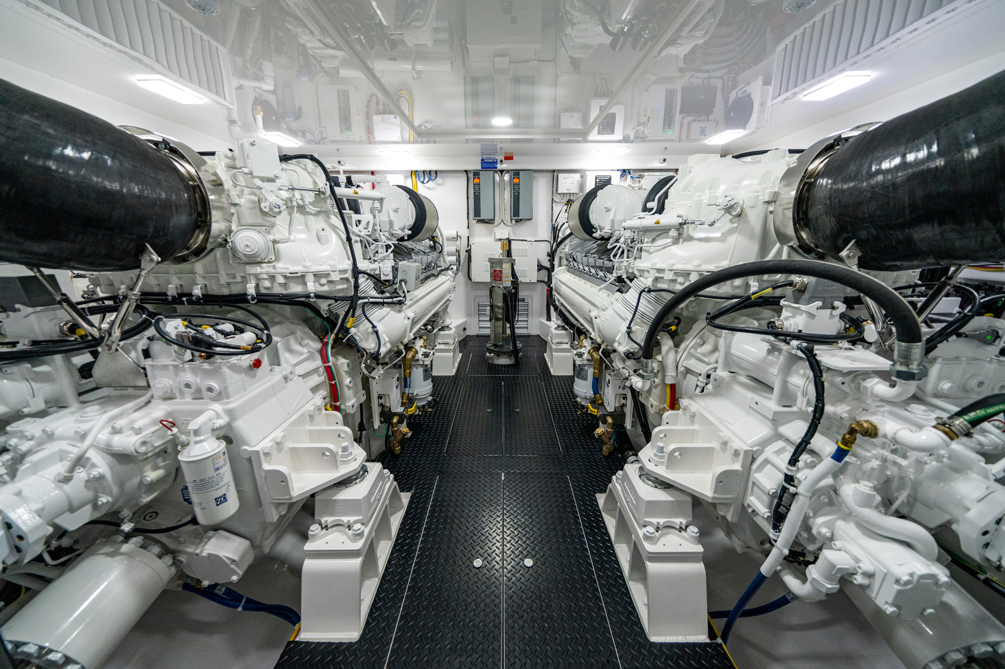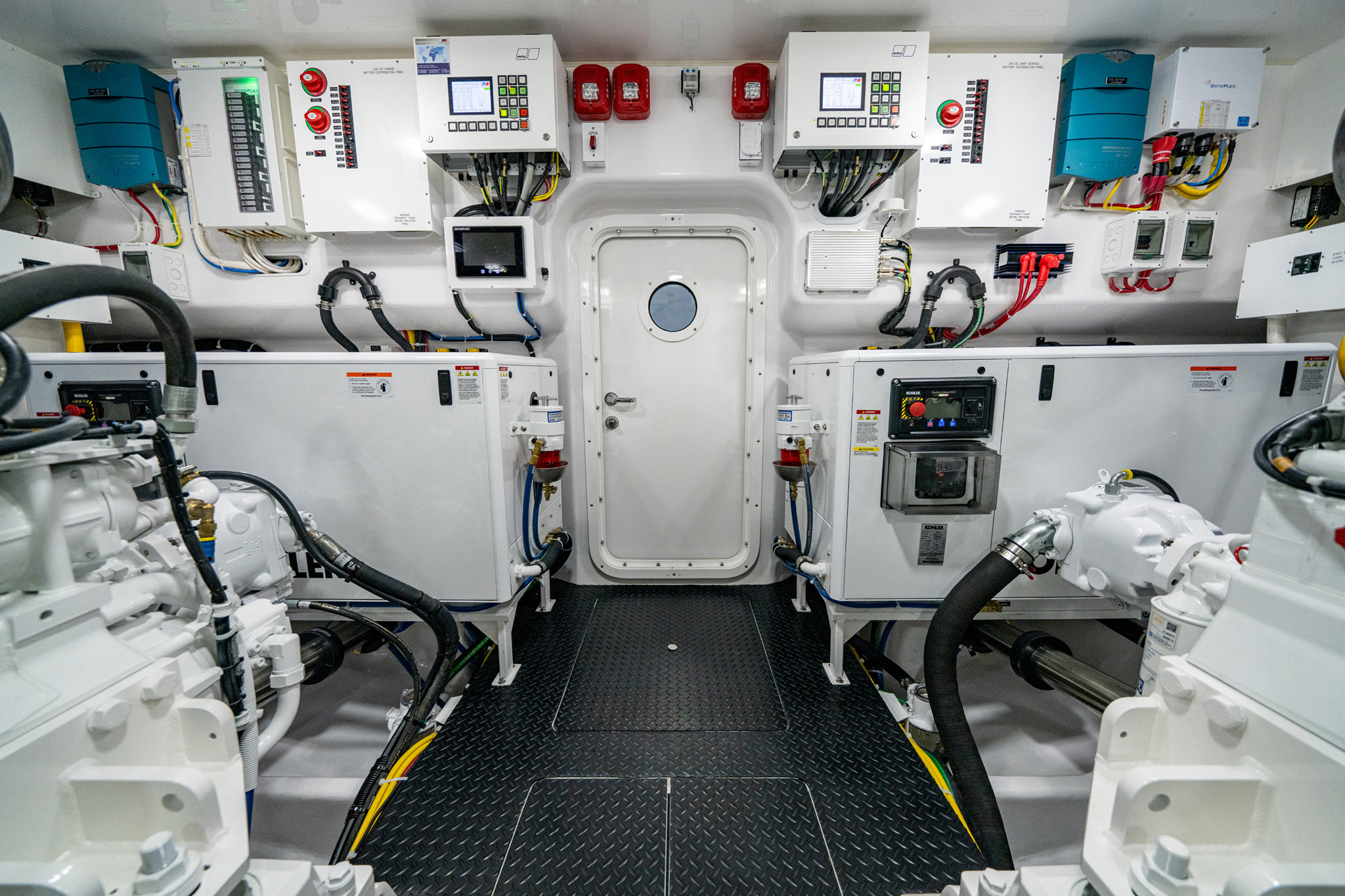The standard 32 kW generators are aft of the engines for center of gravity purposes; their location also provides outstanding accessibility outboard to the hull-side vents. The Murray Ventilation System utilizes six fans that push and pull a maximum amount of air through the engineroom.